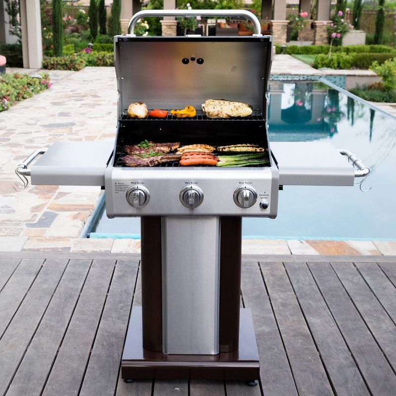The KENMORE 3-burner patio grill is both stylish and spacious. It features 522 sq. in. of cooking space and 30,000 BTUs of power. The generous side shelves fold down for compact storage, making it an eye-catching option for smaller spaces. The sleek base houses an enclosed cabinet to hide that propane tank. This 3-burner patio grill has many convenient features such as electronic ignition for easy lighting, porcelain-coated cast iron cooking grids and a durable porcelain-enameled lid with a stainless steel handle.