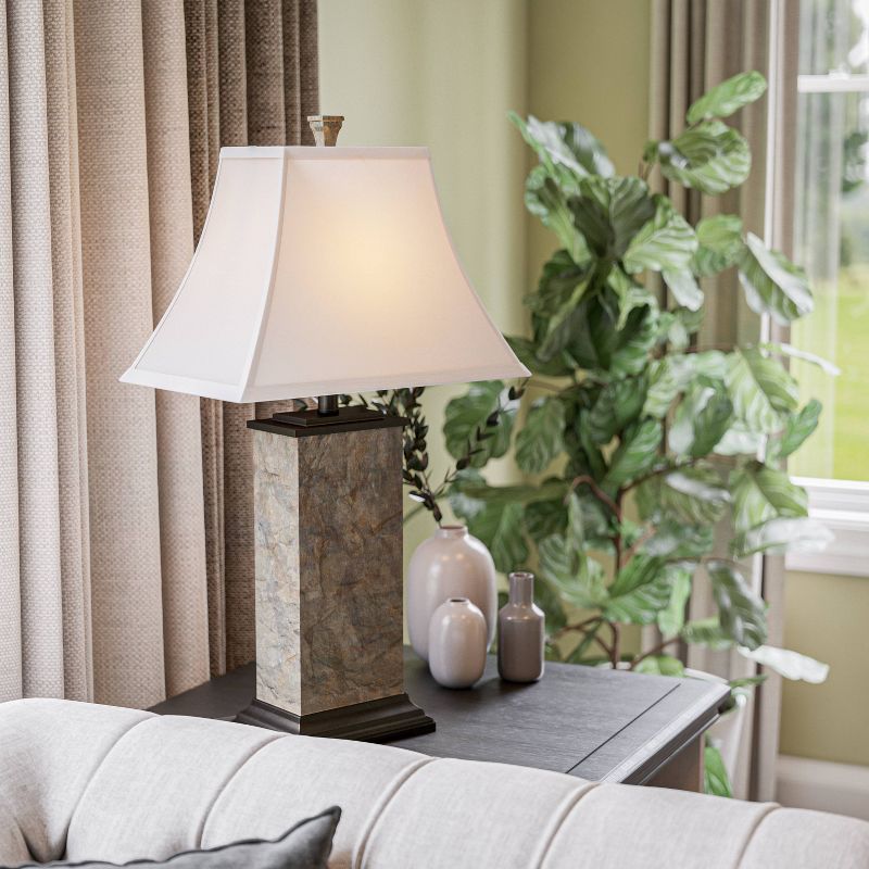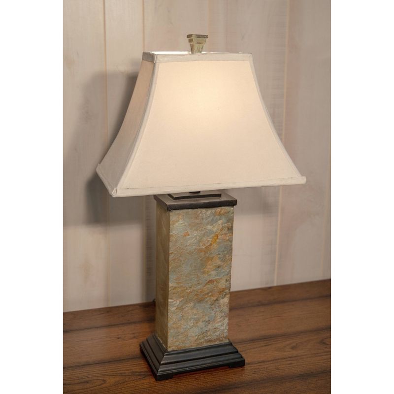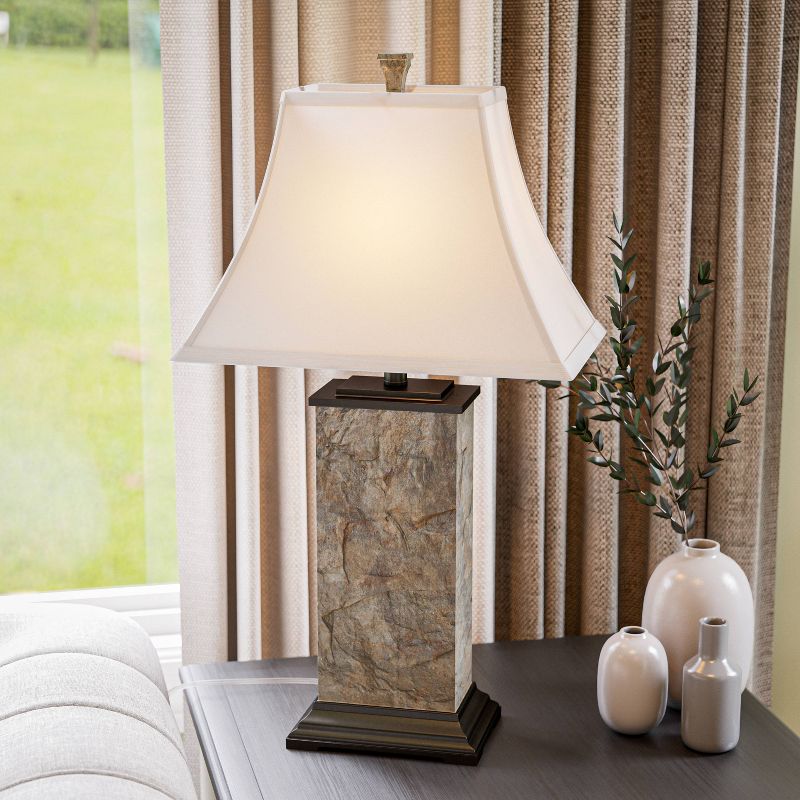 Become one with nature by placing this natural modern table lamp in your home – dressy enough for any formal setting with its elegant marbled slate texture, yet perfect for casual living with its natural elements and creamy earth-tones. Just like in nature, the distinct patterns on each lamp are unique and no two are exactly alike. Place on your end table besides dark colored furniture to accentuate the cream faux suede shades and sturdy bronzed base. But don’t let this work of art fool you – it’s fully functional and you can control the light level with high, medium and low lighting all with a single switch.