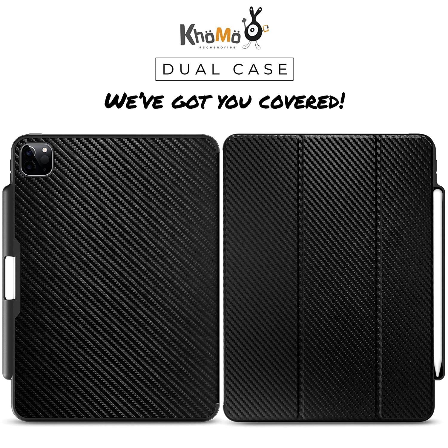 KHOMO iPad Case Pro 11 Case 2nd Generation 2020 with Pencil Holder - Dual Series - Supports Apple Pen Charging - Carbon Fiber, KHO-1679