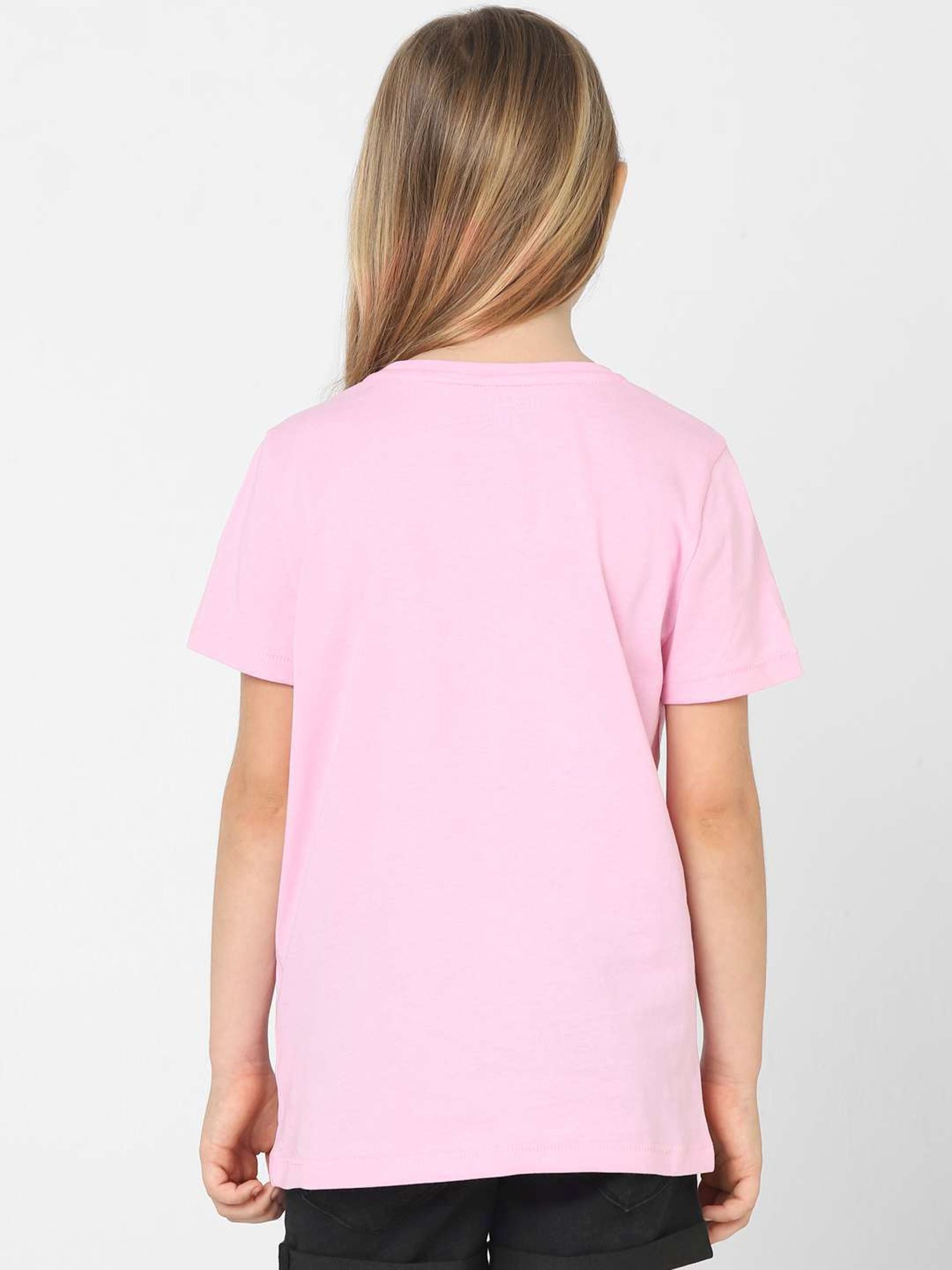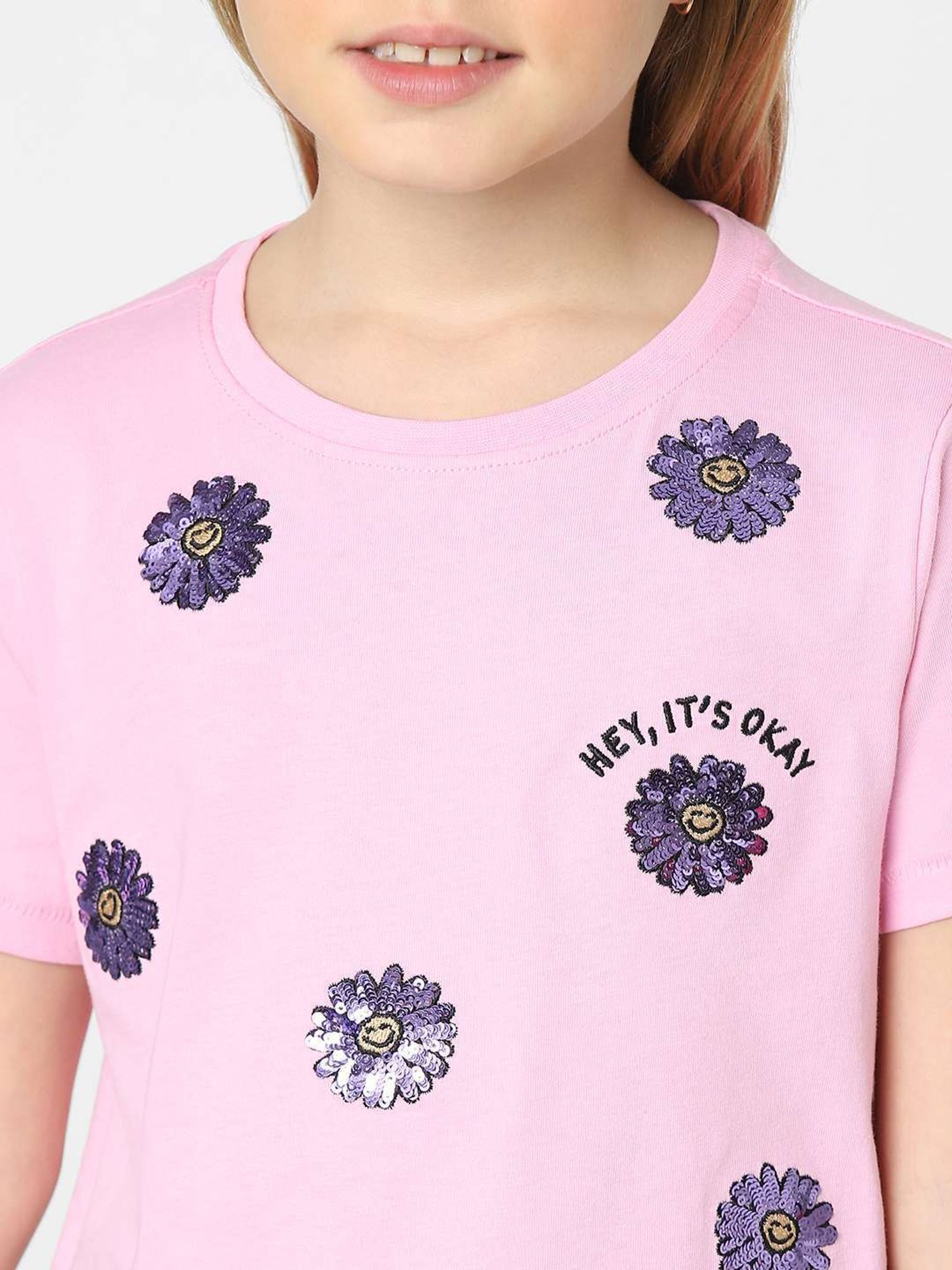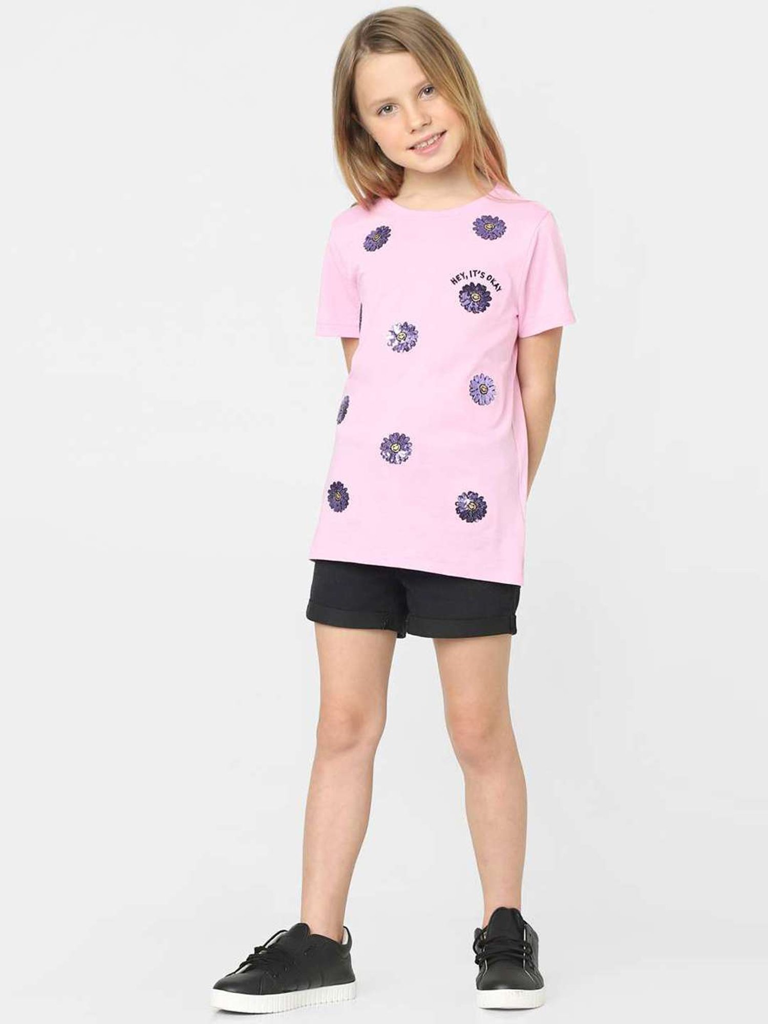 Revamp your little girl's wardrobe with this pink t-shirt from KIDS ONLY. Crafted using premium quality cotton fabric, it will be very soft to the skin. The round neck adds to its appeal. Exuding short sleeves, it is sure to fetch your girl compliments from all. The embellished pattern makes it an eccentric choice. Your princess can team it with a pair of sunglasses for a stylish look.