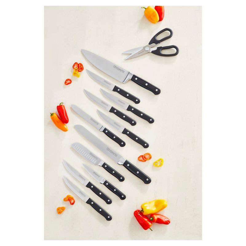 • 14-piece set includes: knife block, chef knife, bread knife, utility knife, santoku knife, paring knife, 6 steak knives, shears, sharpening steel