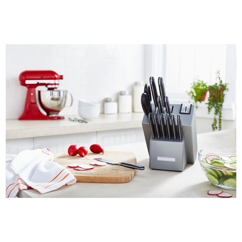 No matter what’s on the menu, you’ll have it made with this diverse 14-Piece Cutlery Set from KitchenAid. Made with German stainless steel, this stunning and enduring knife set gives all chefs the leading edge they crave in the kitchen. Plus, the well-organized silver sleek knife block with its integrated sharpener keeps everything needed within hands reach.