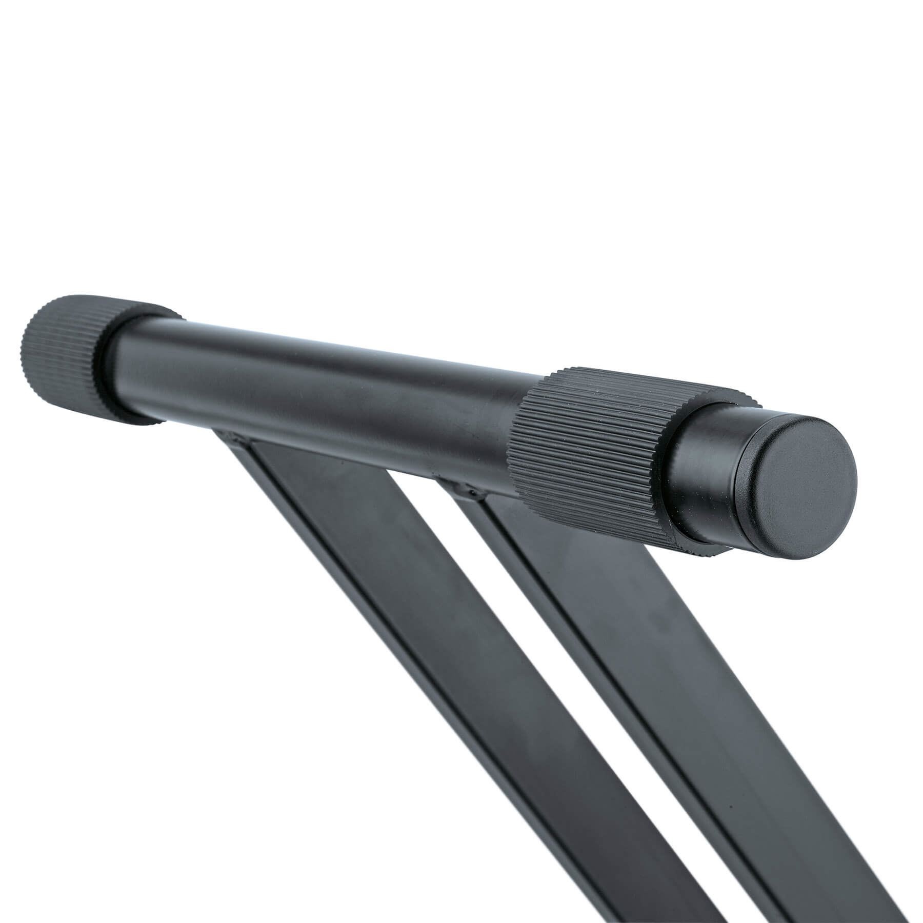 Our best X stand - comfortable and extremely sturdy. The new design of the double brace stand tubes provides for perceptible stability and safety. The ergonomic clamping lever makes it easy to setup and collapse the keyboard stand. The robust metal joint is intermeshed in 5° steps and provides for a multitude of different positions. The scale provides the user with the option to always select their preferred setting. Both of the back rubber end caps can be adjusted on their axis and as such can be adjusted perfectly to the width of the keyboard. The maximum depth is 350 mm. The typical K&M quality characteristics such as solid workmanship, high quality powder coating and a useful adjustable end cap for uneven surfaces complete the overall concept and design. The stand can be expanded for a second keyboard with the 18941 stacker.