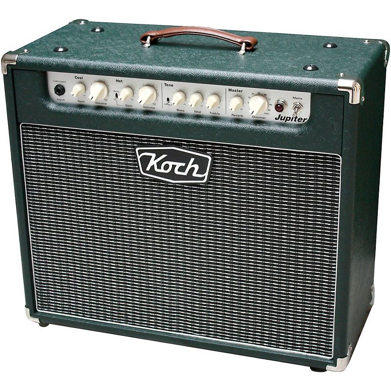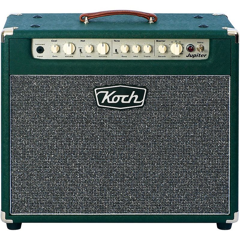 The Koch Jupiter is a 45 Watt boutique, vintage-style combo amp, that is equally at home in live, recording or rehearsal sessions. This unique classic features independent volume and gain controls for both the Clean (Cool) and overdrive (Hot) channels. The overdrive (hot) features a Boost which gives the Jupiter three channels. The shared EQ section (Bass, Middle, Treble) can be further sculpted with the Contour Switch, allowing either a warm, mid-rich vintage tone, or a scooped, more modern and open sound.The Koch Jupiter combo comes with a two-button footswitch that switches between the two channels and activates/deactivates the boost. Other features of the Jupiter include the Dimmer Control which acts as an attenuator to allow real tube saturated tube tone at any volume, front mounted Reverb control, 4/8/16 Ohm Speaker Outputs and Speaker Emulated Direct Output with Passive Filtering. Finally, there is a buffered effects loop to allow the addition of favorite pedals or effects units.