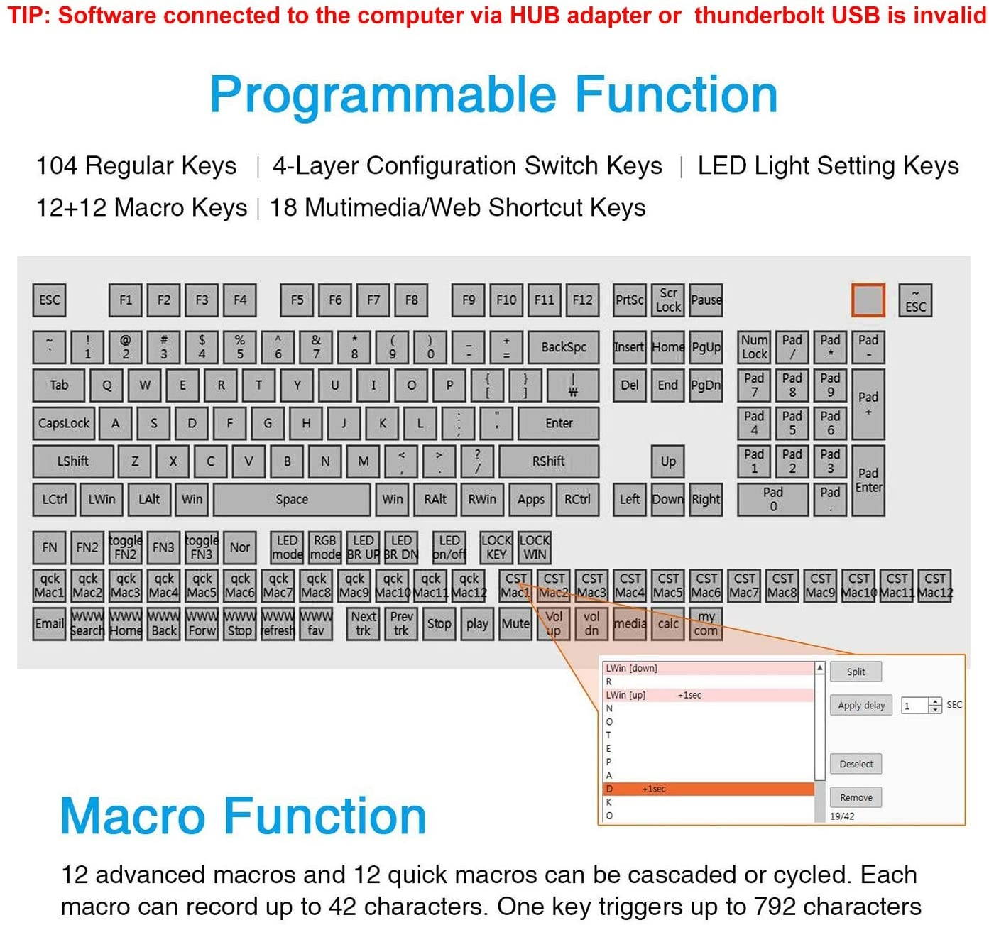 Note:1.When configuring the keyboard's software settings,please make sure your computer has a standard USB type-A interface,the keyboard can only be directly connected to the computer via the USB cable (HUB adapter and Thunderbolt USB will not be supported).The restrictions apply only to configure the keyboard's software.Once set,you can still connect via HUB adapter and thunderbolt USB.2.Please download the keyboard's configuration software according to the URL on the package box/user manual 3.After opening the software,when you need to use the "Key Mapper/Custom Macro/Quick Macro/Options " function,you need to click the "Connect" in the top-left to connect the keypad.Once set up,you need to click the "Upload" to save.Otherwise,all settings are invalid.Normal/FN/FN2/FN3 4-Layer Configuration You can set up Normal/FN/FN2/FN3 4-layer configuration. * You need to set a shortcut key of the FN layer in the Normal layer,When you need to enter a key on the FN layer,you need to press and hold the FN key on the normal layer,and then press the key of the FN layer that you want to enter.(The other FN2/FN3 layers are the same method,and the FN2/FN3 has a toggle button,only need to press once to switch to the FN2/FN3 layer,needn't hold it down when using)Custom Advanced Macro You can set up 12 advanced macros (with time delay) and 12 quick macros (without time delay).Each macro can record up to 42 characters.A total of 24 macros can be cascaded or cycled.Such as: