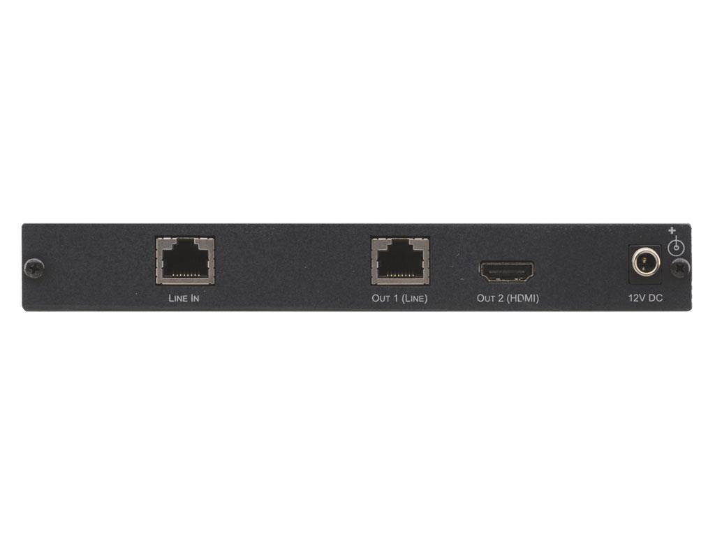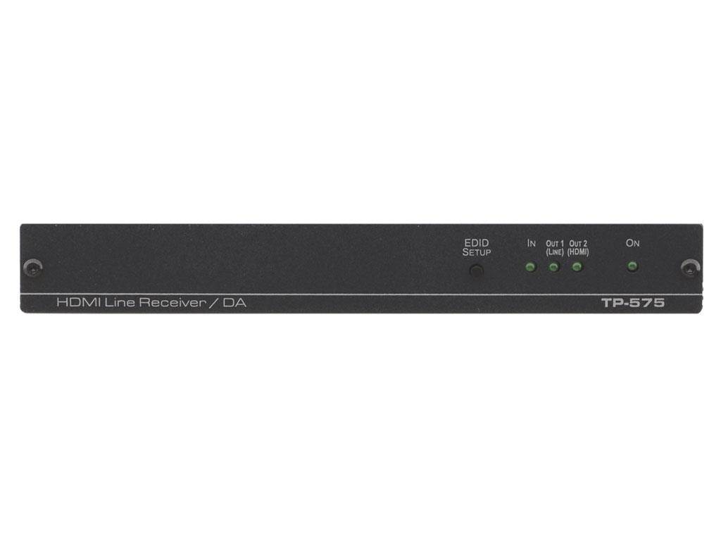 The TP-575 is a DGKat twisted pair line driver for HDMI over twisted pair signals. The unit receives a twisted pair signal and outputs both an HDMI and twisted pair signal to a compatible receiver. Max. Data Rate - 1.65Gbps per graphic channel. Inputs - 1 DGKat TP on an RJ-45 connector. Outputs - 1 DGKat TP on an RJ-45 connector, 1 HDMI connector. HDTV Compatible. HDCP Compliant. DGKat Signal Integration - Kramer's unique technology for converting TMDS as well as control and communication to signals that run over twisted pair cables. We strongly recommend using Kramer DGKat cables designed specifically for optimum performance. HDMI Support - HDMI (V.1.4 with x.v.Color, HDMI Uncompressed Audio Channels, Dolby TrueHD, DTS-HD). 3D Pass-Through. EDID PassThru - Passes EDID signals between the source and display. HPD Pass-Through - Passes Hot Plug Detect signals from display to source. Active Input/Output LED Indicators. System Range - Up to 90m (295ft) at 1080i, or up to 30m (98ft) at 1080p on shielded BC-DGKat524 cable. Up to 90m (295ft) at 1080i, or up to 70m (230ft) at 1080p on shielded BC-DGKat623 cable. Up to 100m (330ft) at 1080i or up to 90m (295ft) at 1080p on shielded BC-DGKat7a23 cable. Cable - For optimum range and performance, use Kramer's BC-DGKat524, BC-DGKat623 and BC-DGKat7a23 cables. Note that the transmission range depends on the signal resolution, graphics card and display used. The distance using non-Kramer CAT 5, CAT 6, and CAT 7 cables may not reach these ranges. Use only shielded cable where both ends of the shield are soldered to ground. Compatible Receivers - PT-572+, TP-574, TP-575, TP-576. Output Signal Reclocking - Daisy chains up to 6 receivers for maximum range of 600m using shielded BC-DGKat7a23 cable at 1080i. (For other cables and resolutions, see System Range above.) Power Connect System - A single connection to the TP-575 powers the transmitter, receiver and line driver units. Compact MegaTOOLS - 2 units can be rack mounted side-by-side in a 1U rack space with the optional RK-T2B universal rack adapter. Specifications: INPUT: 1 DGKat TP on an RJ-45 connector. OUTPUTS: 1 DGKat TP on an RJ-45 connector, 1 HDMI connector. BANDWIDTH: Supports up to 1.65Gbps bandwidth per graphic channel. COMPLIANCE WITH HDMI STANDARD: Supports HDMI and HDCP. CONTROLS: EDID SETUP button. INDICATOR LEDS: IN, OUT 1 (LINE), OUT 2 (HDMI), and ON LEDs. POWER SOURCE: 12V DC, 950mA. DIMENSIONS: 18.8cm x 11.4cm x 2.4cm (7.4 x 4.5 x 0.9) W, D, H. WEIGHT: 0.3kg (0.67lbs) approx. ACCESSORIES: Power supply. OPTIONS: RK-T2B 19 rack mount, Kramer remote external receiver, Kramer BC-DGKat524 (CAT 5 24AWG), BC-DGKat623 (CAT 6 23AWG) and BC-DGKat7a23 (CAT 7a 23 AWG) cables, HDMI/HDMI male-to-male cables.