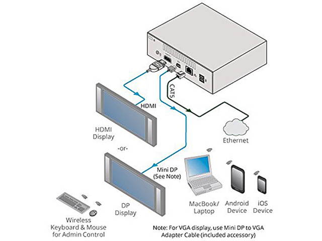 VIA Connect PRO is a wireless collaboration and presentation solution that makes sharing and presenting in meetings easier. With any laptop or mobile device, users can view, edit and comment on documents in real time, share files and chat with individuals or multiple participants simultaneously. The solution can show up to four screens on the main display. From any laptop or mobile device, students, teachers or any in-room meeting participant can view the main display, edit documents together in real time, share any size file, turn the main display into a digital whiteboard, and more. The solution features iOS mirroring for MacBook, iPad, iPhone, Windows phone and Android mirroring (Lollipop OS 5.0 or newer).VIA Connect PRO is ideal for huddle rooms, offering the best price-performance in the market. 60fps Streaming Multimedia - Share HD wireless video streaming (us...Graphics Modes (Content): Full HDMaximum Frame Rate: 60 fpsNetwork Technology: 10/100/1000Base-TEthernet Technology: Gigabit EthernetHDMI Out: YesNetwork (RJ-45): YesUSB: YesNumber of Network (RJ-45) Ports: 1Number of HDMI Outputs: 1Height: 1.6Width: 4.6"Depth: 4.5"Weight (Approximate): 1.10 lbPackage Contents: VIA Connect PRO Power Cord Kramer mini DP to VGA Adapter VESA Mounting Bracket Limited Warranty: 3 YearPackage Contents VIA Connect PRO Power Cord Kramer mini DP to VGA Adapter VESA Mounting Bracket "