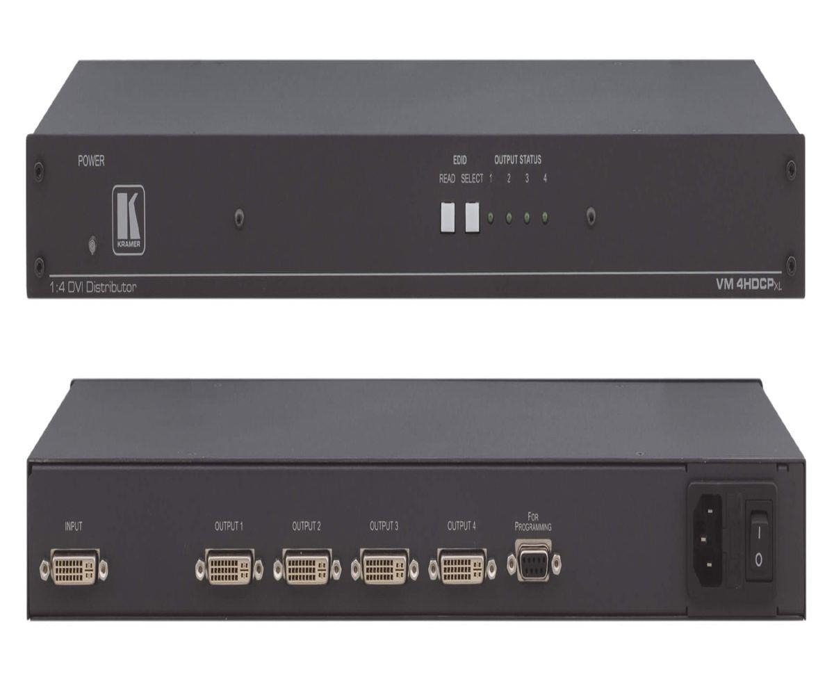 The VM-4HDCPxl is a high-performance distribution amplifier for DVI signals. The unit reclocks and equalizes one input signal and distributes it to four identical outputs.