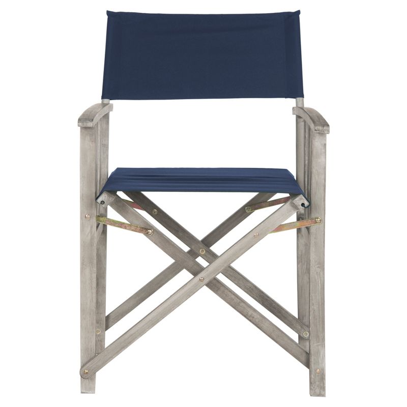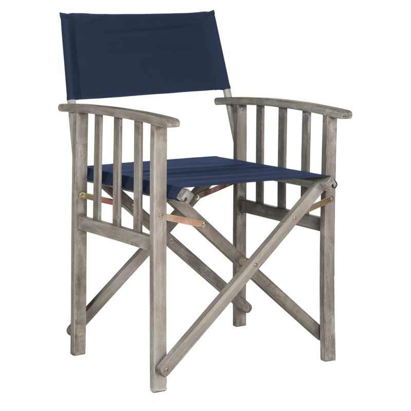 Give your porch or patio a touch of Hollywood glam with a pretty and practical set of two Laguna outdoor director chairs. These folding chairs are crafted of eco-friendly acacia wood in a natural finish with spiffy navy all-weather Textilene fabric. The slim sleek design adds a cool modern touch to the room. The Laguna Director Chair is sold in a set of two. This item does require assembly and is advised to be covered when not in use outdoors.