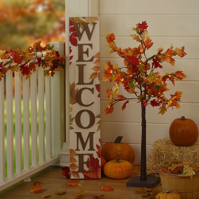 This autumn welcome sign leans effortlessly next to your front door, or against a fence or porch railing. Features decorative leaves imbued with the warm colors of fall. A distressed, farmhouse-inspired finish adds timeless sophistication to this vertical porch sign. Makes a charming companion to your outdoor autumn harvest decorations. Wood. 48"H x 10"W x 1"D