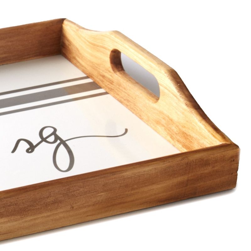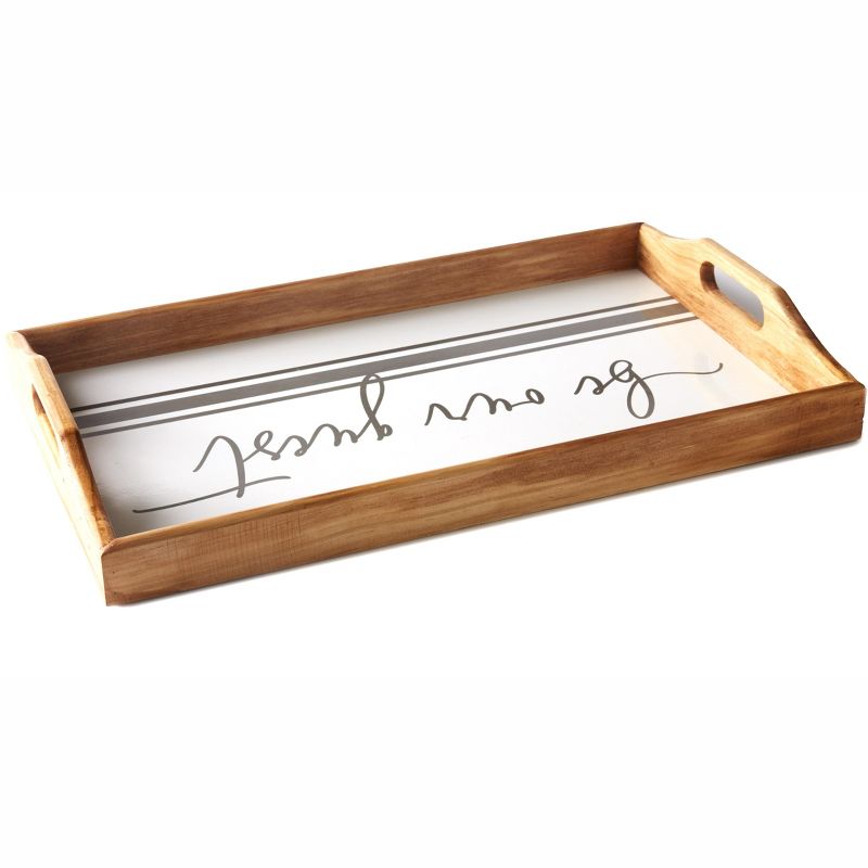 This cute wooden tray is ideal for a guestroom with its printed sentiment message of welcoming guests. It has the message and offers functionality. You can use this rustic serving tray for meals, snacks, or appetizers for any occasion. Use it for guests to drop their keys in or to store items while everyone mingles. This wooden serving tray is both decorative and functional to delight guests. It's easy should it become dirty such as from spills or catching scraps. This wood serving accent tray is ideal for serving guests thanks to its handles. You can also give it as a gift to family and friends who are in the catering and service business. Wood. 19-5/8"W x 11-3/4"D x 2-5/8"H, overall.