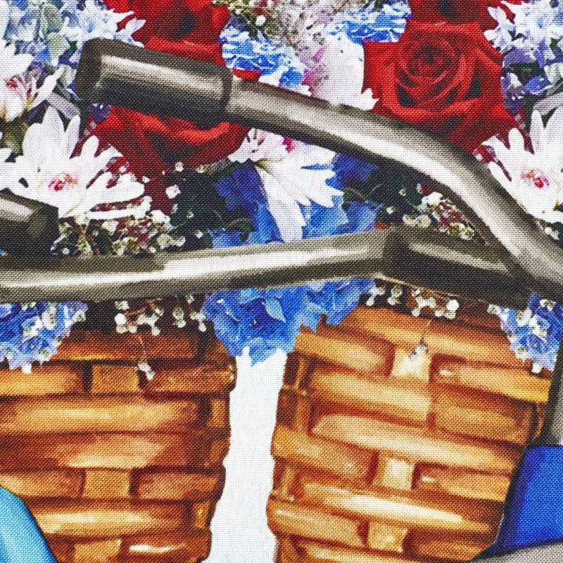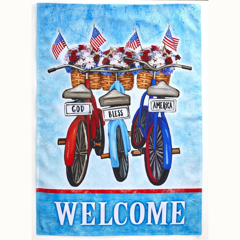 Welcome guests by flying this decorative summer flag off the side of your house or from a porch banister and support beam. Enhance your home's outdoor decor with this patriotic flag. Across the license plates on the back of the 3 bikes, it reads, "God Bless America" from left to right. The bikes all share an Americana color scheme. A fitting decoration for Memorial Day, the bike baskets are filled with red, white and blue flowers. This hanging house flag can be used all through the summer season. The patriotic decoration also has American flags propped in the bicycle baskets. It looks like the flags are riding away from you because of the back ends of the bikes. Polyester. 28"W x 40"L.