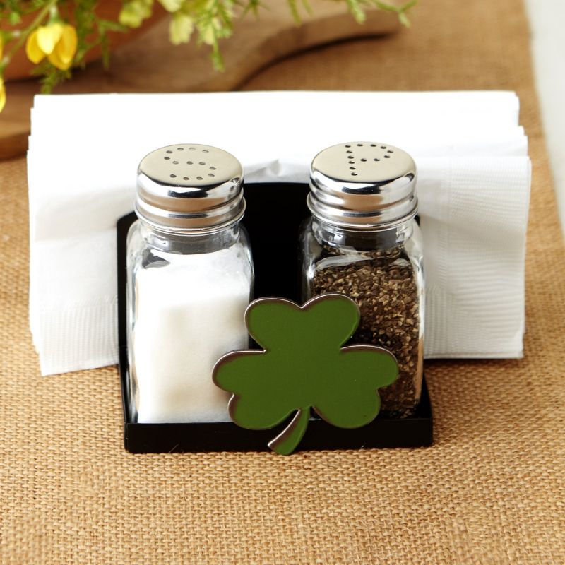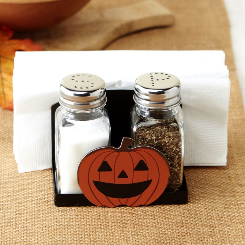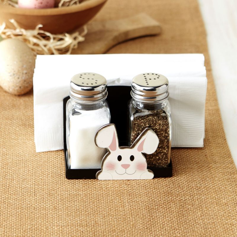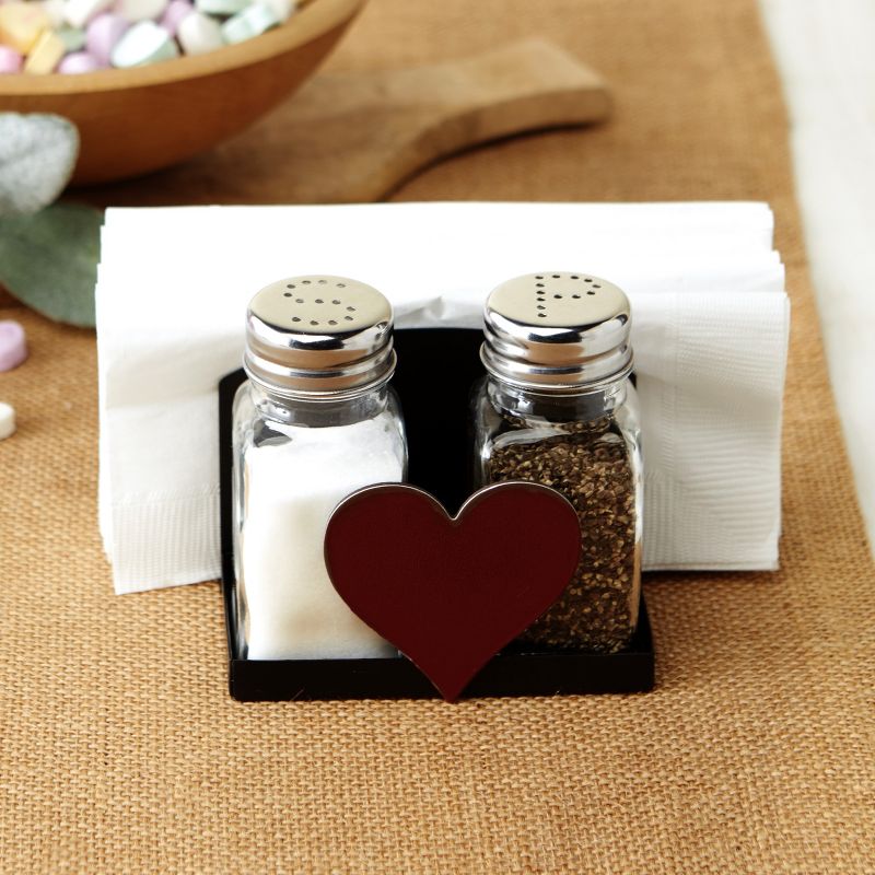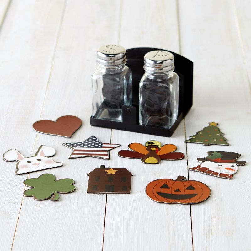 Add utility to any tabletop with these two pepper and salt shakers that come with seasonal accents. Sturdy glass and the metal tops means it will last for many seasons to come. Their clear color complements any table spread for any occasion. On the front of the metal tray, you can place a seasonal icon on it and choose between a house, star, heart, shamrock, pumpkin, bunny, turkey, snowman and a Christmas tree. Metal, magnet, and glass. Gently shake out and wash by hand. 3-3/4"W x 4"D x 3-3/4"H
