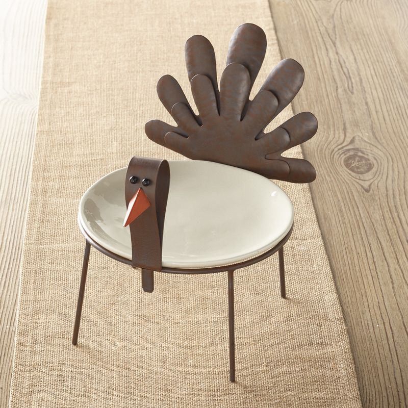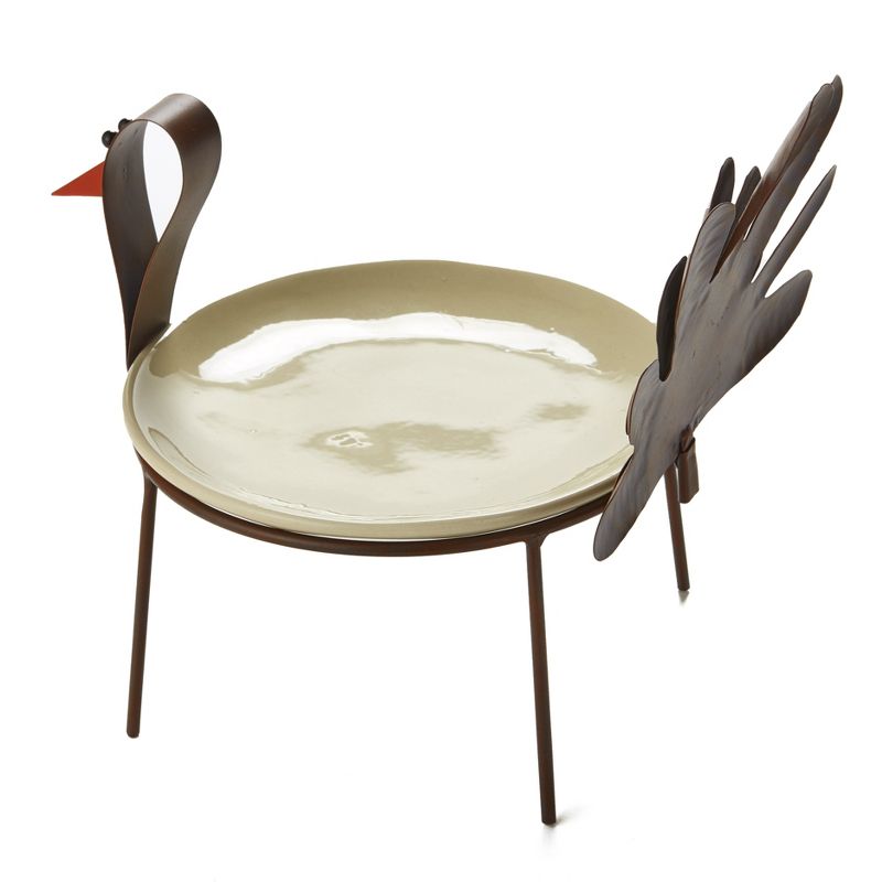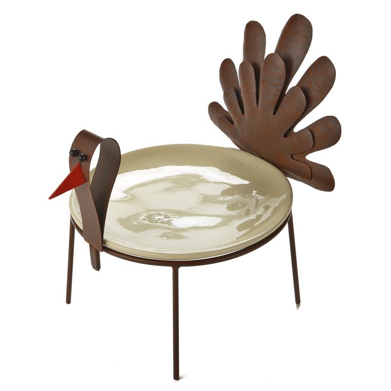 This decorative platter features a distressed, metal stand with a turkey design, adding a fun and functional decor element to your Thanksgiving feast. The turkey figurine features a rustic look reminiscent of galvanized metal. The result is a Thanksgiving decoration that's a charming addition to your farmhouse kitchen decor. Place nuts, dips, or classic Thanksgiving foods inside to delight your friends and family members. 8-1/8"W x 10-3/4"D x 10-1/8"H. Metal and ceramic. Easy assembly required