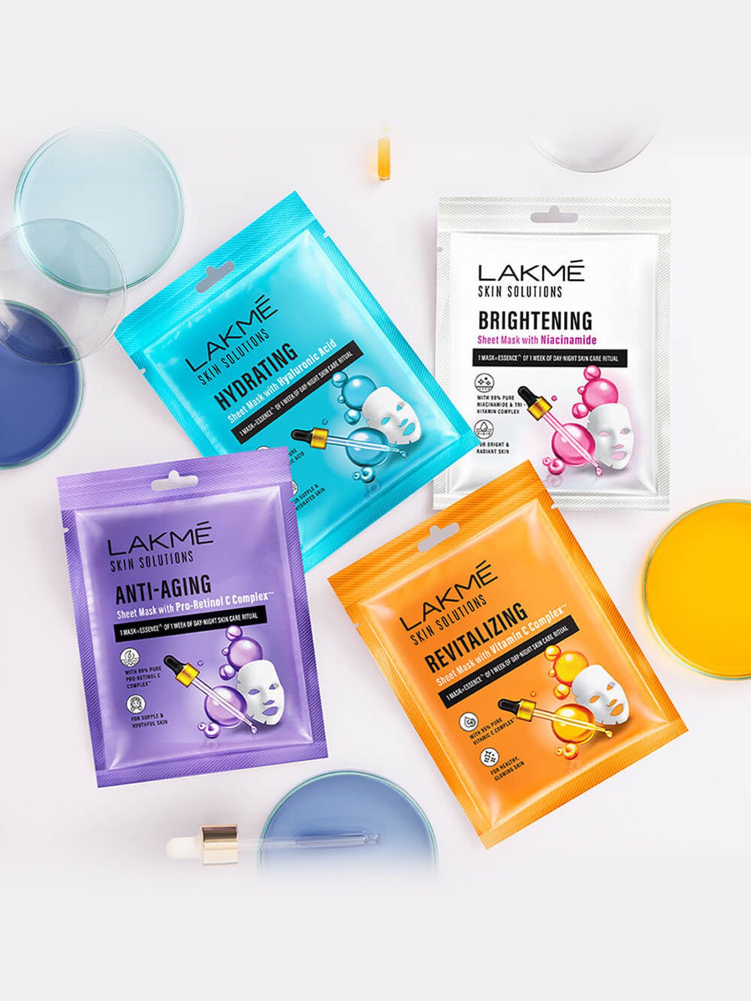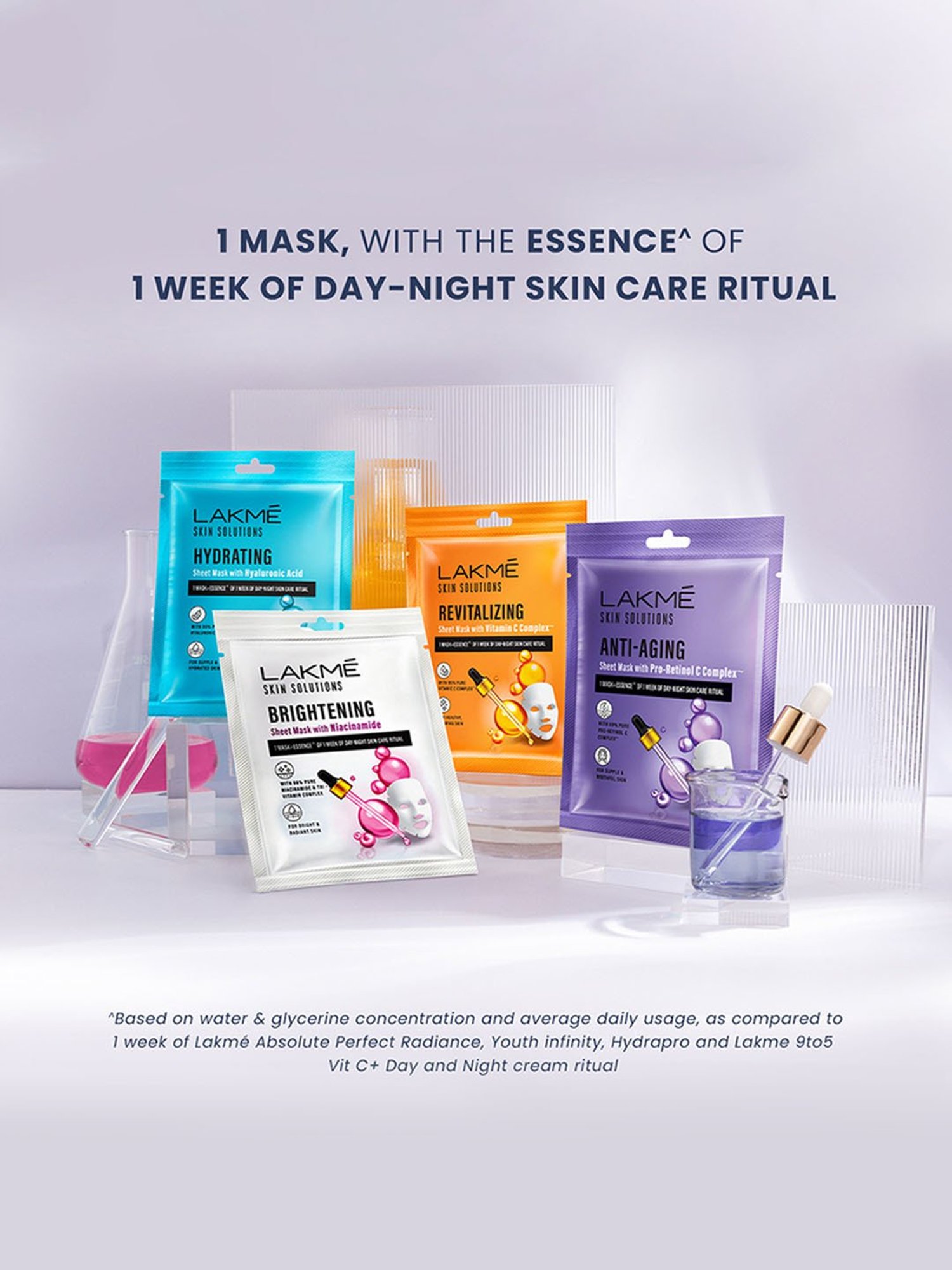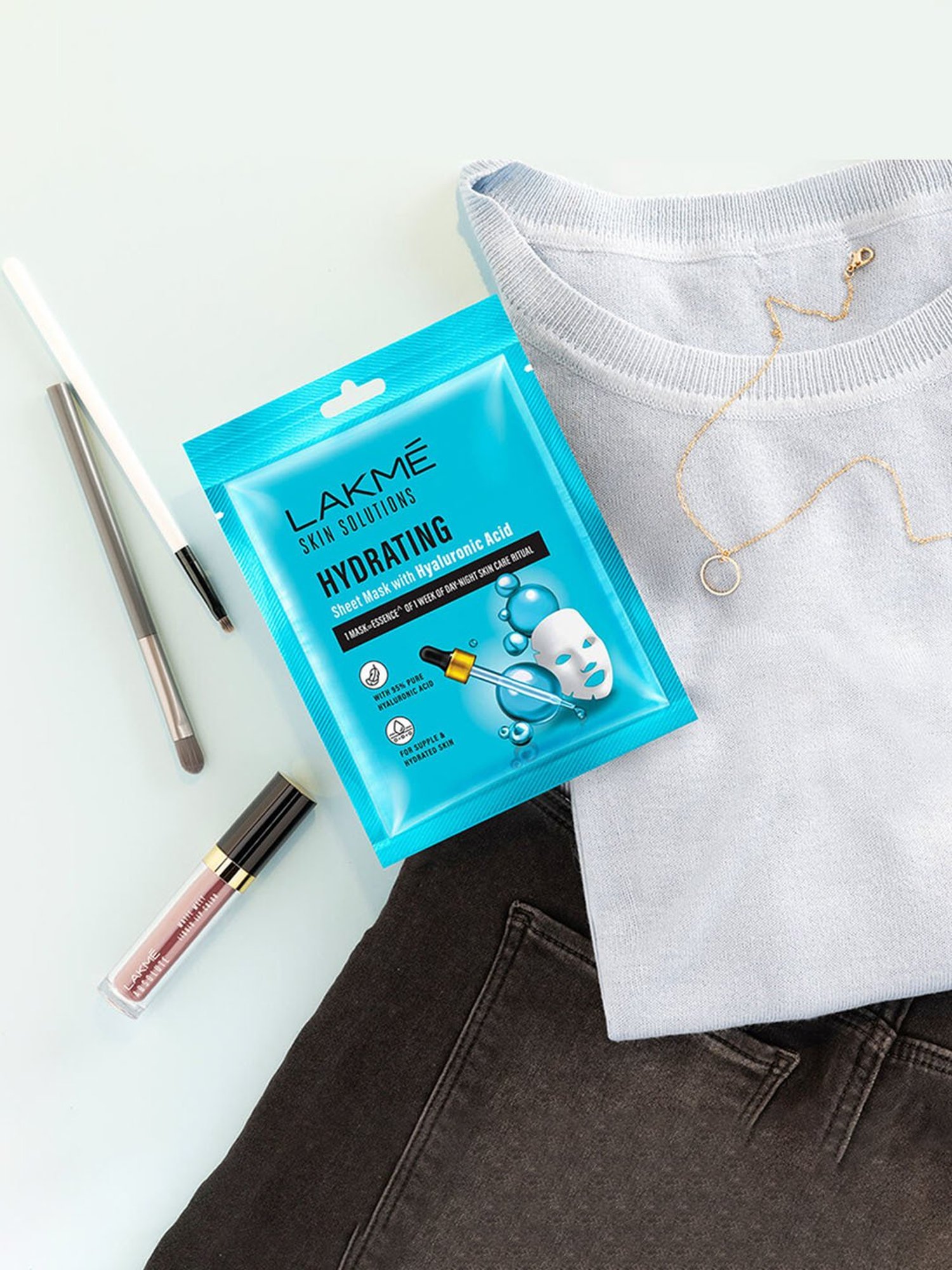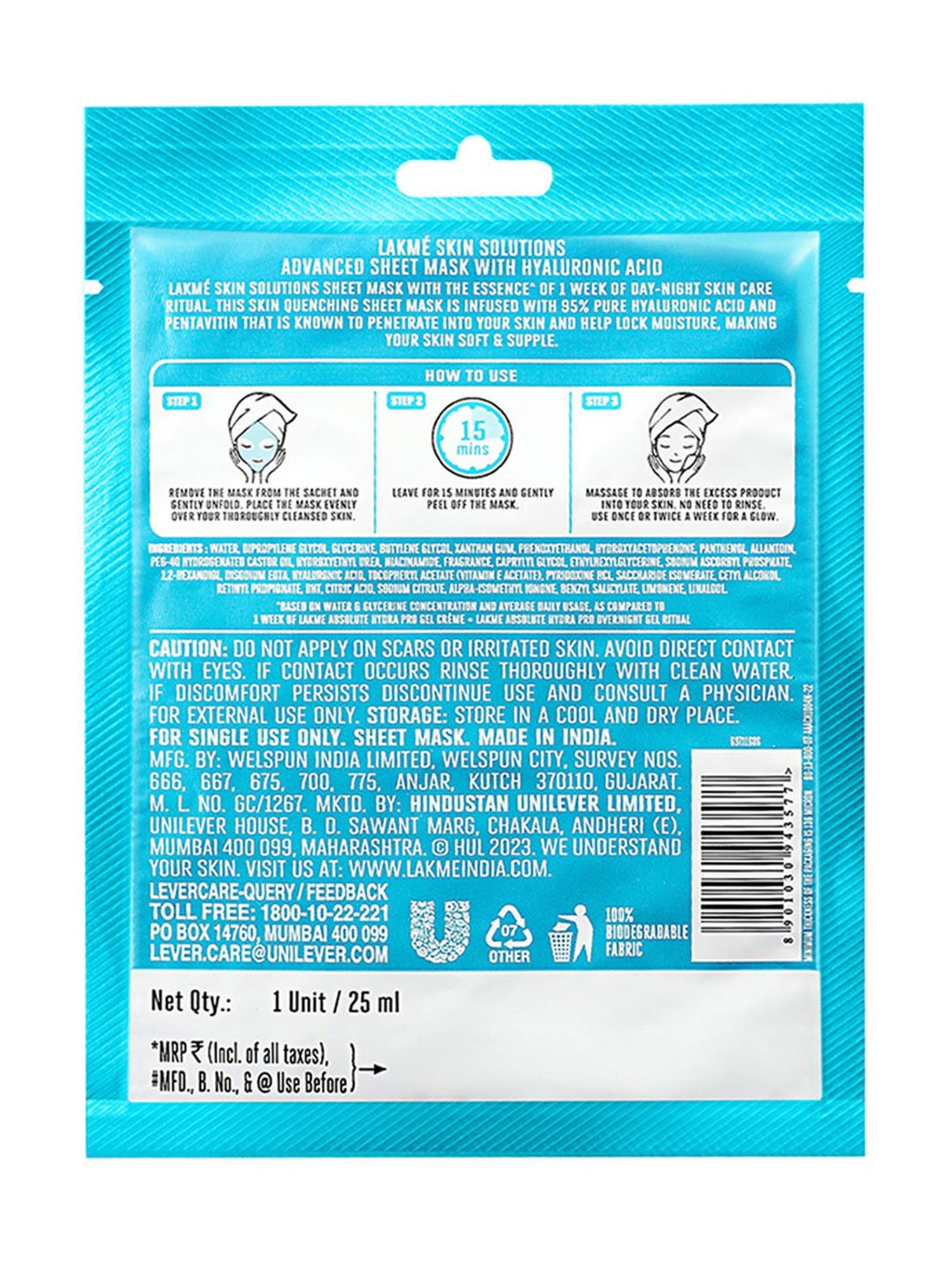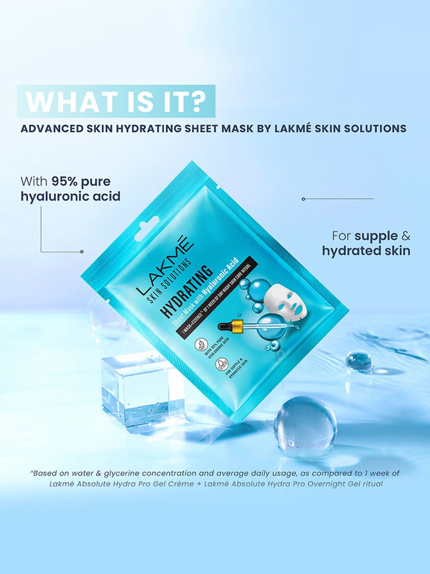 We bring to you advanced range of serum infused sheet masks. New Lakme Skin Solutions Sheet Masks with serum-infused technology, 1 mask gives you 7 days of essence of one week of day-night skin care ritual in just 15 minutes. Lakme's next revolution in sheet mask, 4 sheet mask target different skin needs and gives you a variety to choose from. Whether it is energizing, brightening, hydrating or supple skin, we have got you covered. Hydrating sheet mask - Infused with 95 percent pure hyaluronic acid and pentavitin, for supple and hydrated skin.