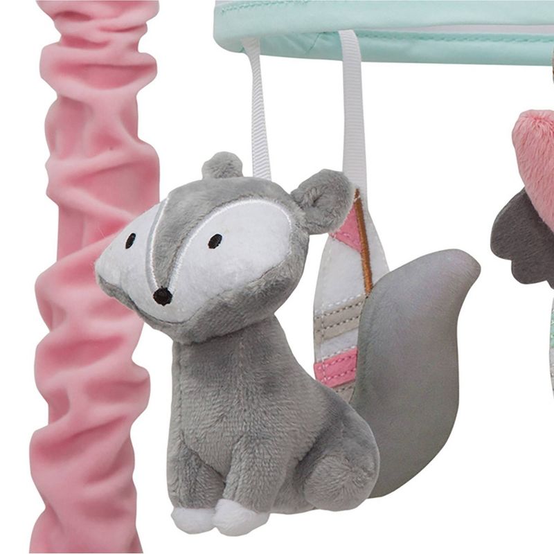 A gray diamond embroidered ring twirls sweet little foxes, an owl and three colorful feathers. The mobile is covered in a pretty coral fabric and plays Brahms Lullaby, Twinkle Twinkle Little Star, and Rock-A-Bye Baby. The mobile plays for 20 minutes, has volume control and an on/off switch. Battery operated. Requires 3 AAA batteries. This mobile fits all standard and most convertible cribs. Easy to follow instructions included. Makes a great baby shower or welcome home baby gift. Imported.