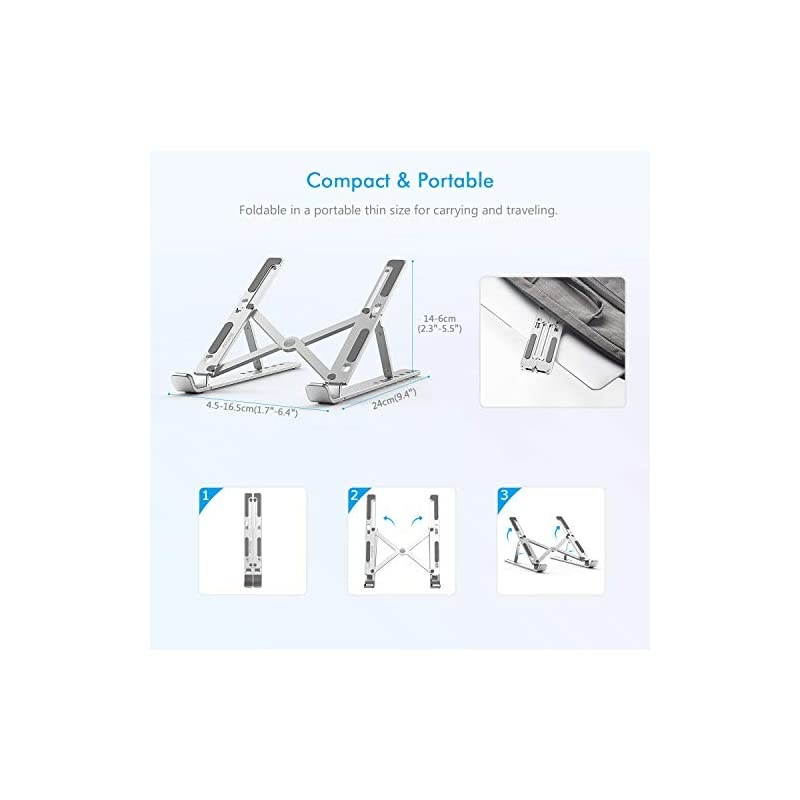 ***** **********Best Quality Guranteed. *****Adjustable in 6-levelsThe portable laptop stand provides 6 levels of height adjustment, you can adjust the height according to your needs. The ergonomic design makes it easy to watch and type with comfort. It will help reduce stiff back and neck. *****Sturdy & ProtectiveThis laptop stand is made of aluminum alloy and it is scratch-resistant and durable. The slide-proof silicone pads on the stand keep the stand from sliding. The protective hooks ensure your computer does not slide off the stand. *****Compact & PortableWith innovative and lightweight design, it is easily stored and transported.