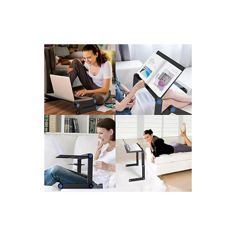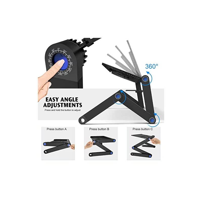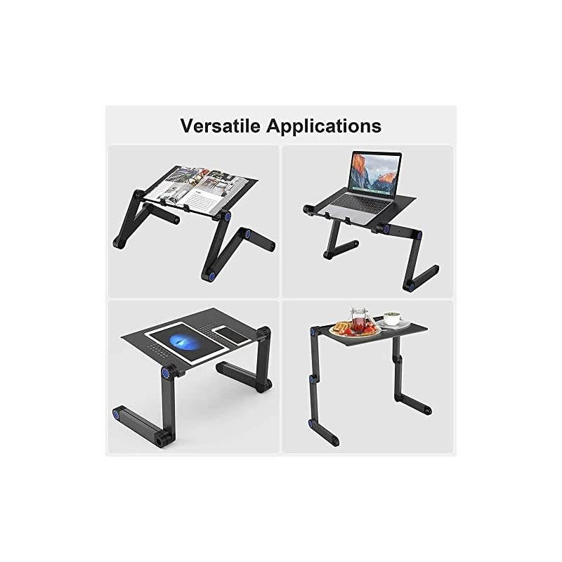 ***** **********Best Quality Guranteed. *****LIGHT WEIGHT & STURDY MATERIALThe Portable Folding Laptop stand desk adopts light and high-intensity aluminum tray with 2 anti-slip legs and 6 robust adjustable ABS auto-locking joints, which could hold your computer securely at any angle*****COOLING FANThis silent CPU fan is powerful through USB ports to suck hot air from under your laptop for active heat dissipation, the easiest way to keep your computer cool*****360 DEGREE ADJUSTABLEEach folding leg has 3 knobs which can adjust and lock in any height and angle you need. There are many different ways to move the legs for different heights or angles.