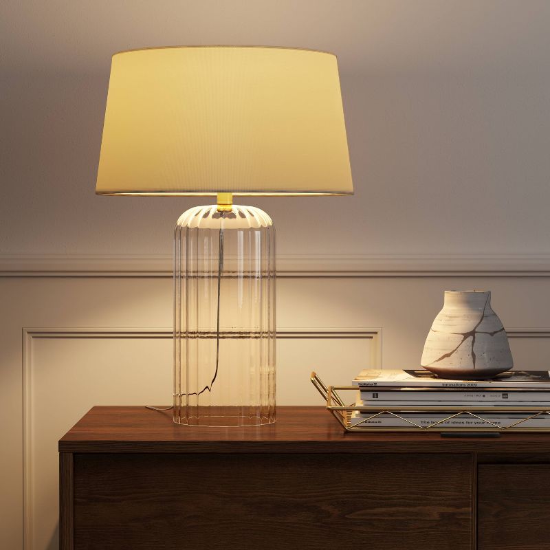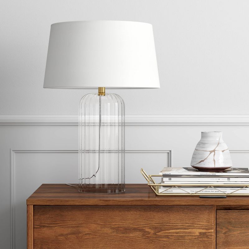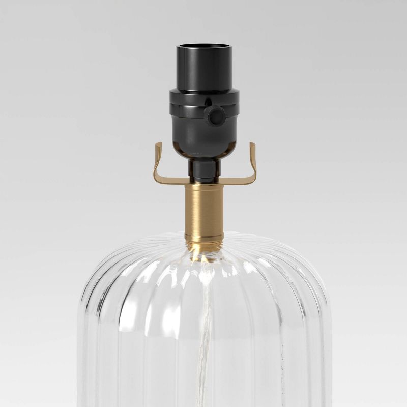 No matter your color scheme, this versatile clear glass table lamp by Project 62 adds a touch of elegance to your room. The unique, yet timeless ribbed glass design will look great for years to come. Pair it with a light-colored shade for a clean look. Includes a saddle that can support a harp and final (sold separately) so it can work with both spider fitter and slip UNO fitter shades. Available for purchase with or without an energy-efficient LED light bulb.