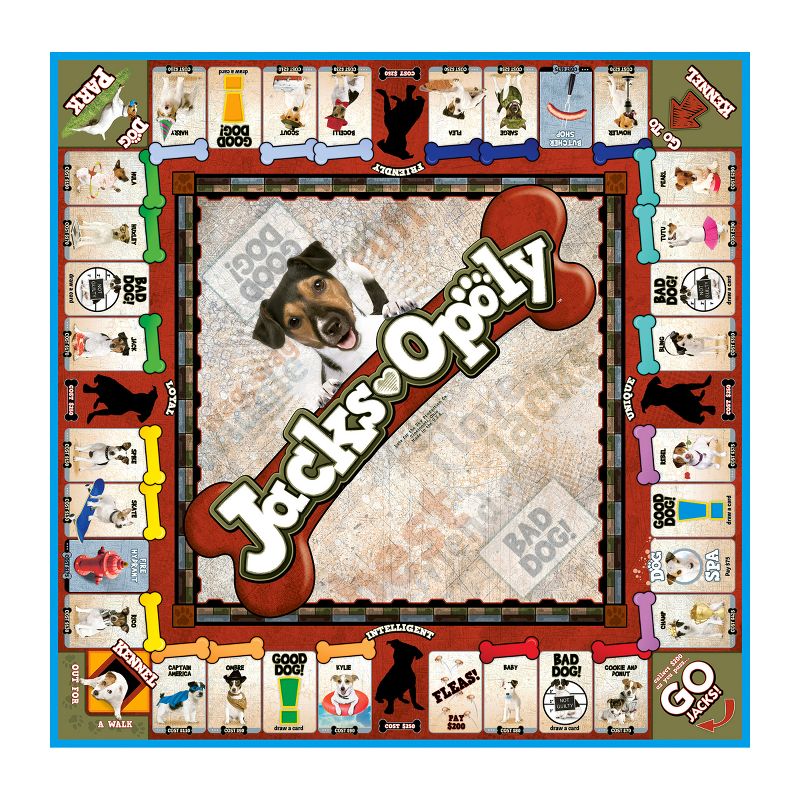 Jacks-opoly is a game of tail-wagging fun! Collect your favorite Jacks and play hard! Increase your rent by buying Toys for your dogs and upgrading them to Big Bones. Sounds easy enough until you get fleas, have an accident on the carpet, or you're sent to the Kennel - then you're out of the game for three turns! Whatever happens... it's a doggone good time! Traditional play or 1 hour version.