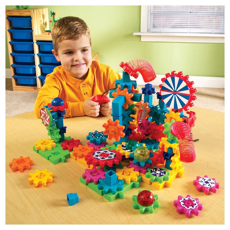 Learning Resources Gears Lights and Action motorized building set uses bright light and movement to bring construction to life. Complete with gears, flashing lights and a power motor, it puts children's creativity into motion. This set is a great way for your child to expand his problem-solving and fine-motor skills by figuring out how each piece fits together and how they operate as a system. It can be combined with other Gears, Gears, Gears sets for endless imaginative possibilities. For children ages 4 and up.