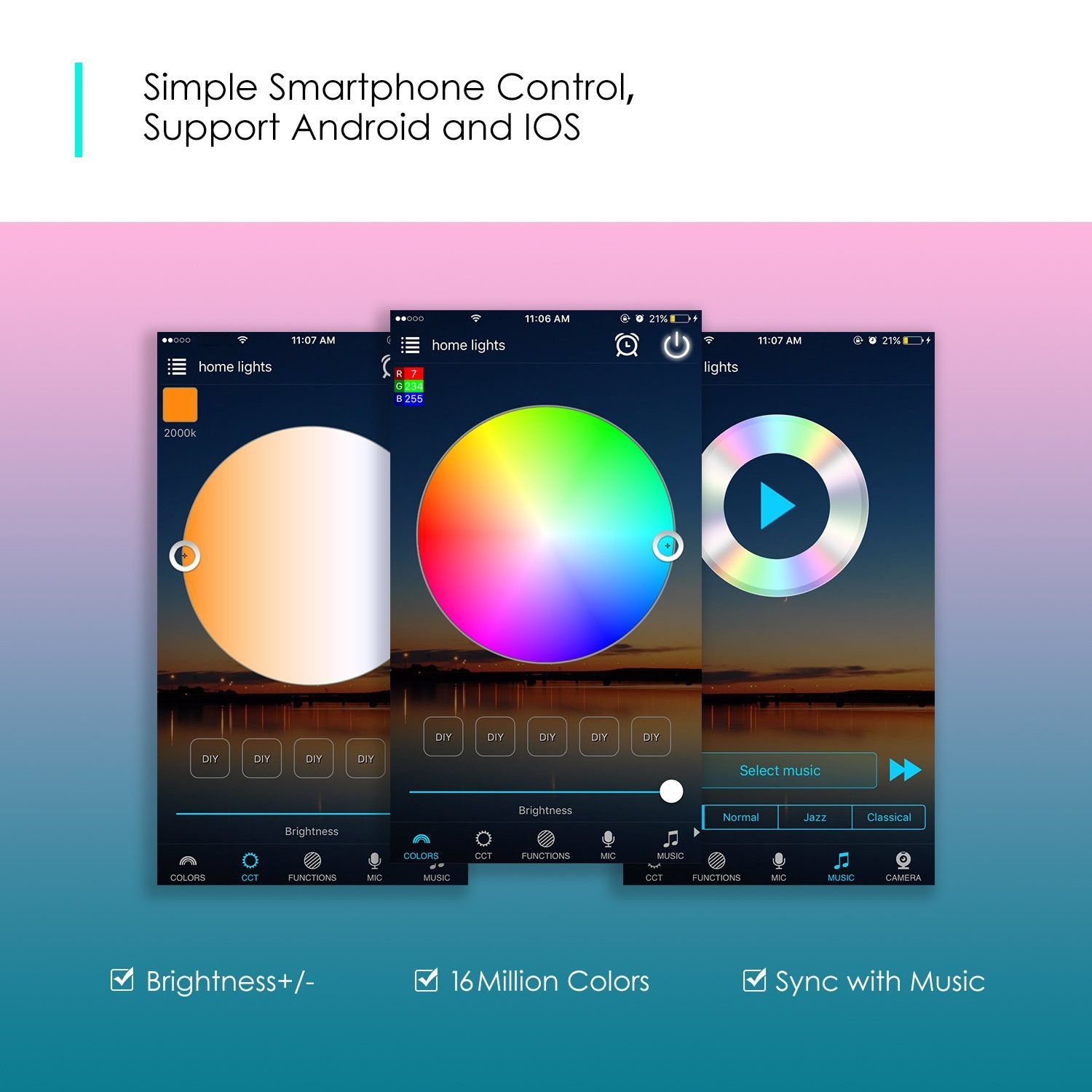 WiFi Smart Control: By downloading a free “Margic Home Pro” app on your smartphone, you can remotely control your led tape lights from wherever you are (support android system above 4.0 and IOS system above 9.0 )