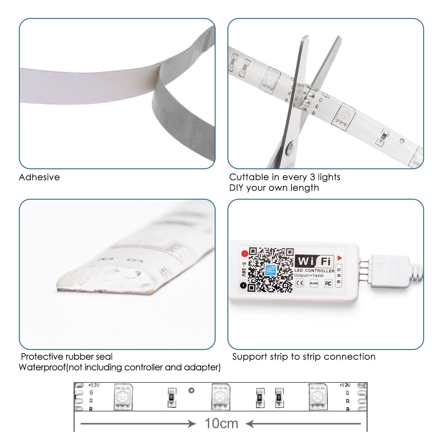 Connectable: The light strip can be cut every 3 leds to make it shorter without damaging the rest strips (make sure to follow the cutting mark), you can also reconnect your strip light end to end with a 10mm 4-pin connector (not included). Slim and flexible PCB strip has Self-adhesive backing so that you can tape it to anywhere with clean, dry and dust-free surface. You will get a wifi controller, a reel of 5m strip light and an qualified power adapter all in one kit, great for home decor, add accent to your bedroom, dining room, living room, automobile, kitchen, upstairs, patio and more; or architectural decoration for hotels, clubs, shopping malls, to create the right ambience especially for show exhibition, holidays and events like Wedding, Christmas, Thanksgiving, New Year Parties Flexible strip lights Trim your self-adhesive strip lights along the cutting mark to go with corners of dry, clean and smooth surface such as cabinet, closet, mirror, bed frame, etc. The strip is also waterproof and withstand pressure with a layer of protective rubber seal covering the circuit.