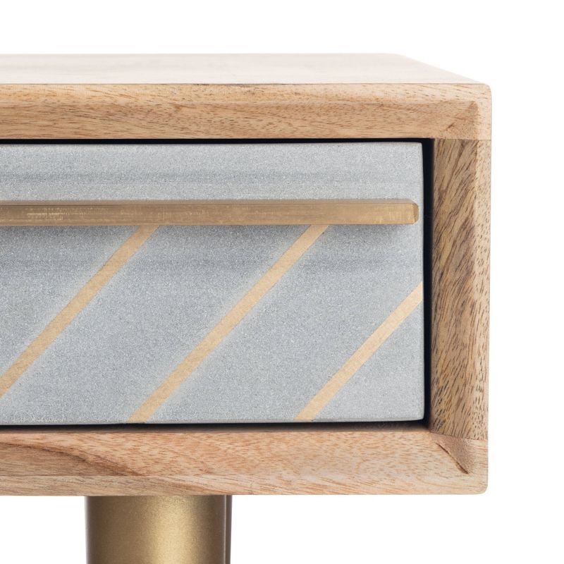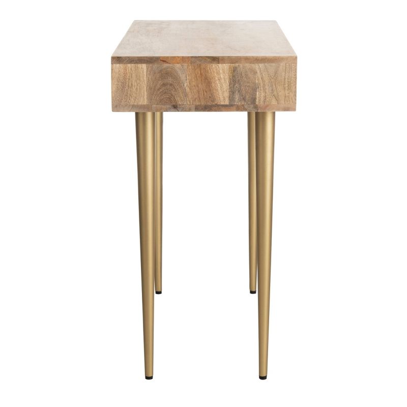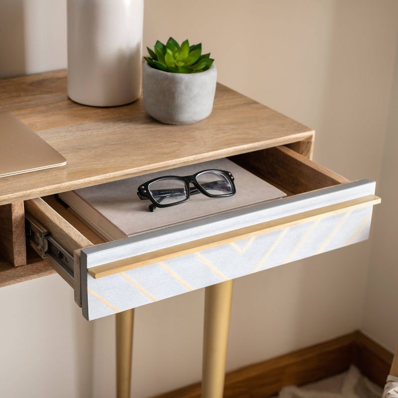 Designed with clean lines and warm, retro flair, this contemporary desk elevates any home office with effortless style and versatility. Perched on radiant brass legs, its beautiful natural wood top features an ample drawer with a rich, sophisticated cement gold finish. The open compartment sleekly provides space for books and other personal belongings while the drawer removes clutter by keeping items hidden and free from sight. A new contemporary addition for the home office or foyer.