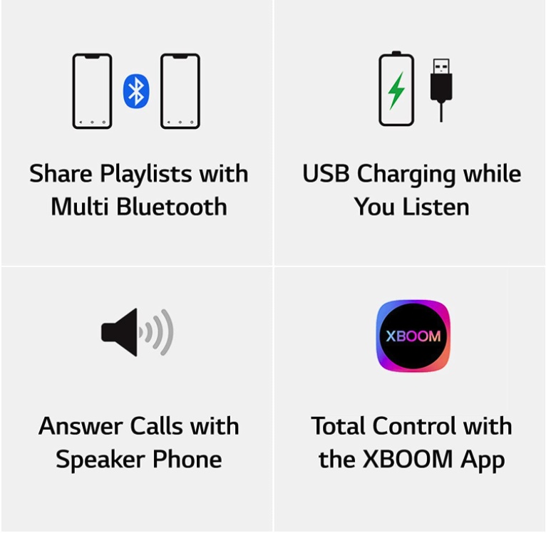 KEY FEATURES: Share Playlists with Multi BluetoothPair two devices at the same time via the XBOOM App. Use any of the connected devices to seamlessly control a playlist with no interruption to music. Convenient USB-C chargingKeep the party going. The portable LG XBOOM Go speaker features long-lasting battery life*** and easy USB Type-C charging— so you never run out of juice and the party never has to stop. Turn your speaker into a speakerphoneIt's easier than ever to share a conversation with friends. With LG XBOOM Go's Bluetooth. capability, you can answer calls with the touch of a button and turn your gathering into a group chat for those conversations that just have to be shared. Wireless Bluetooth controlControl your speaker from your mobile device. When you download the LG XBOOM Bluetooth app, you can manage the audio connection, lighting effects, playlists, equalizer and more with just a few clicks. So you never have to take a break from the dancefloor. Choose Your Favorite XBOOM GoThe XBOOM PL Series is lighter and more compact with a longer battery life, so you can listen to balanced sound wherever you go.