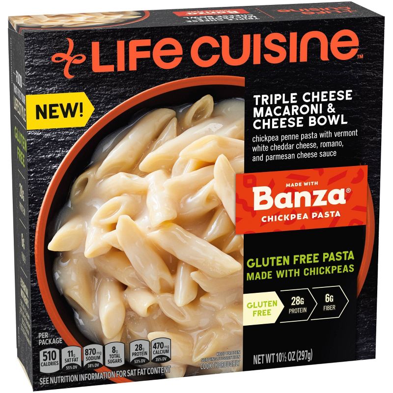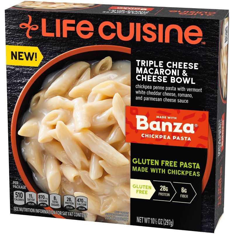Life Cuisine Gluten Free Triple Cheese Macaroni and Cheese Bowl Frozen Meal offers a delicious frozen meal that fits your Gluten Free Lifestyle, with protein and fiber in every serving. Made with 28 grams of protein and 6 grams of fiber, this gluten free frozen dinner features chickpea penne pasta with Vermont white cheddar cheese, Romano and Parmesan cheese sauce. This convenient frozen pasta bowl is ready to enjoy in minutes for your lunch break at work or a quick frozen dinner at home on busy weeknights. Keep Life cuisine gluten free meals frozen until you're ready to prepare.