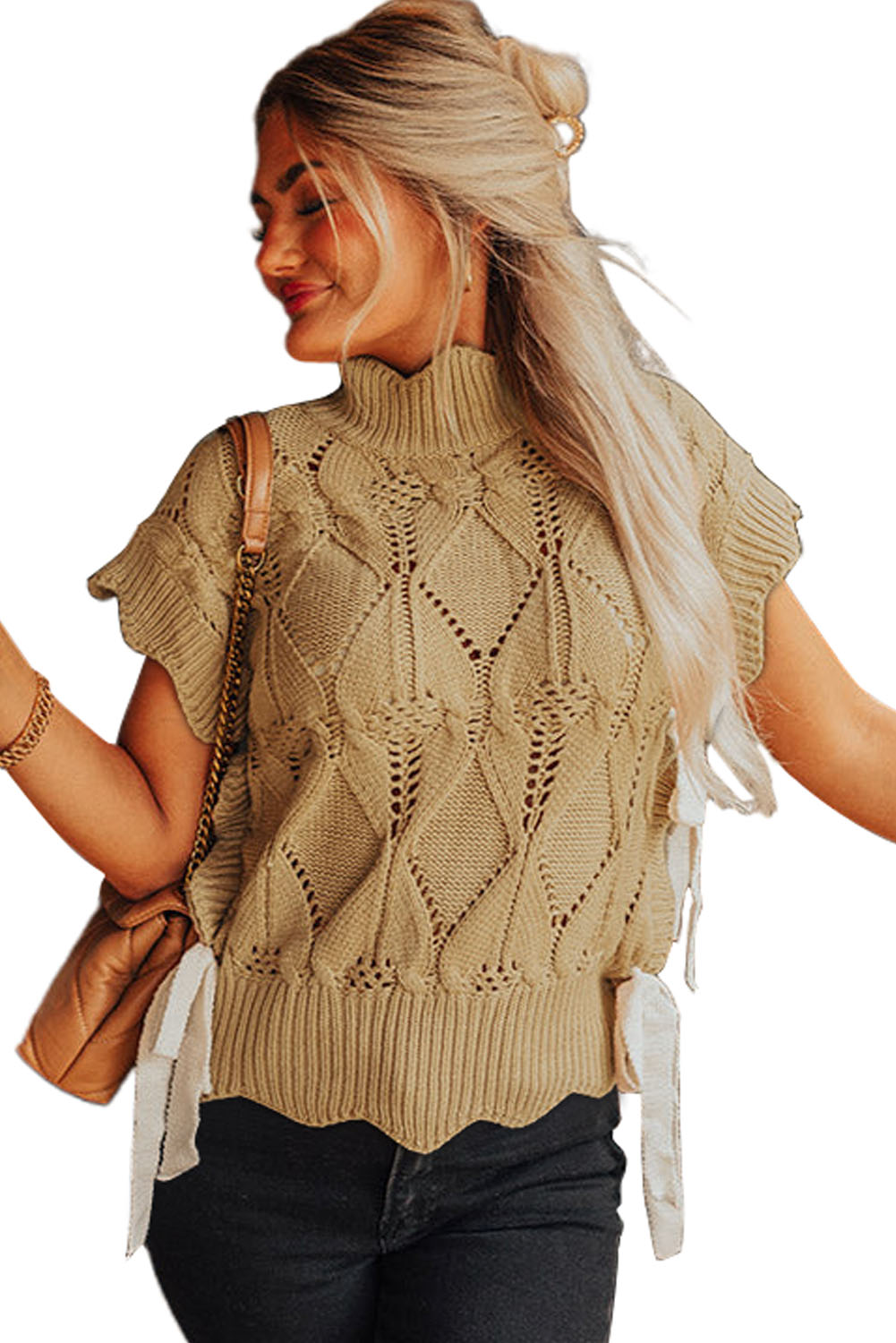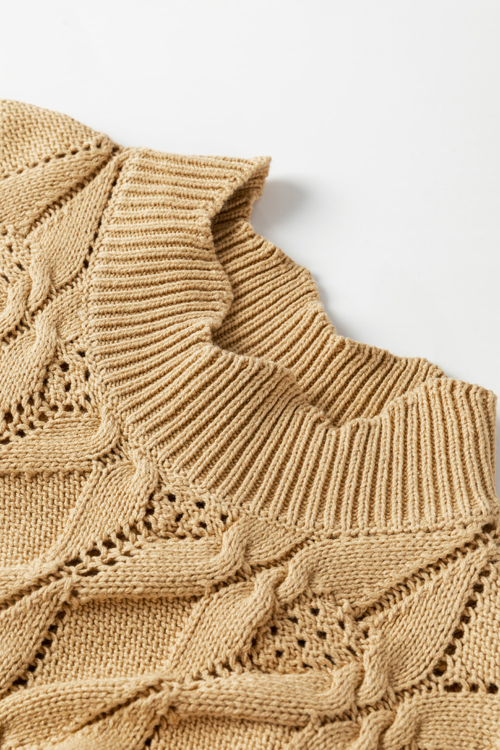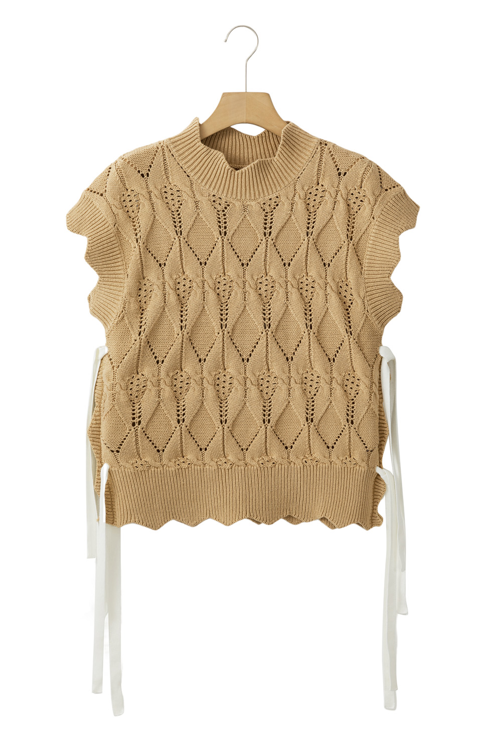 This light French beige sweater features a unique hollowed knit pattern and scalloped trim, adding a touch of sophistication and elegance to your look.
