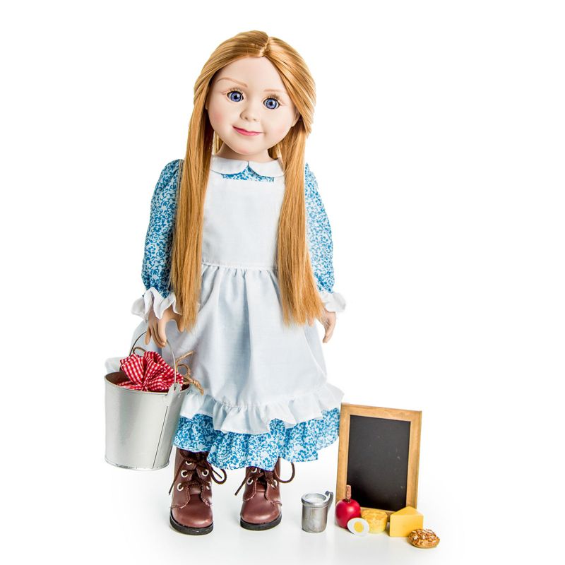 Featuring the officially-licensed Little House on the Prairie 18" Mary Ingalls Doll inspired by Laura Ingalls Wilder's treasured stories. Authentic collection reflects the type of lunch pioneer girls on-the-go like Laura and Mary Ingalls might bring to school. 8 piece set includes a gingham-lined lunch pail with drawstring closure, a cup, hardboiled egg, cheese wedge, biscuit, apple, cookie and a personal chalkboard. Sturdy tin pail keeps 18" doll play food cool and together. Doll measures 18" high. Box measures 18 3/4"L X 7 1/4"W x 4 1/4"D. Exclusively made by The Queen's Treasures, offering the highest quality 18" Doll Furniture, 18" Doll Clothes, 18" Doll Shoes & 18" Doll Accessories! Safety Tested!