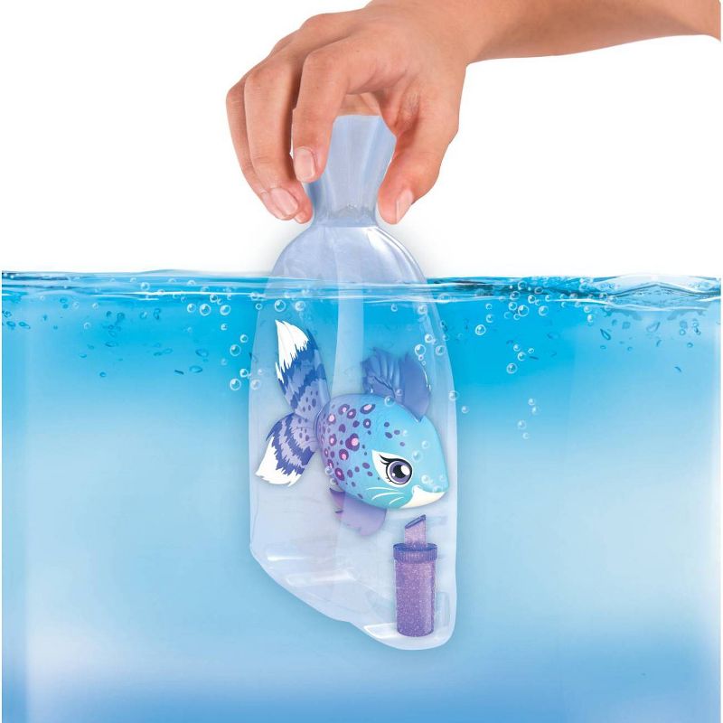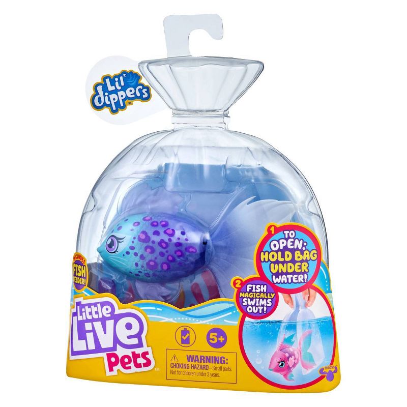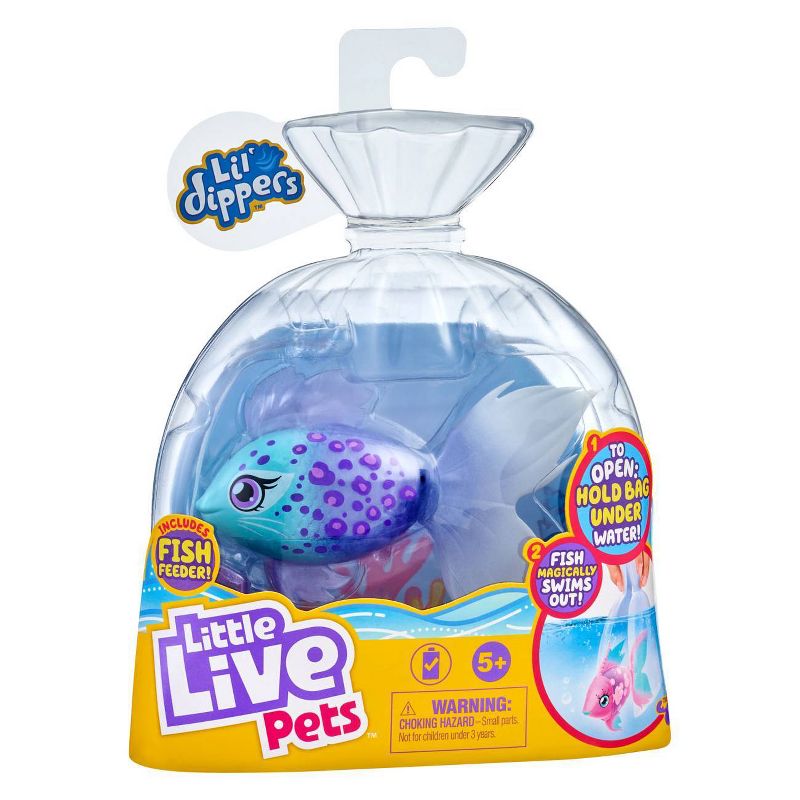 Furtail is a Little Live Pets -Lil' Dipper who loves to swim and show off her fins! This beautiful fish has the most magical unboxing experience! Dip Furtail's bag that she is packaged in into water. As the bag fills, the water activates this beautiful toy fish, and she comes to life and swims out showing off her elegant tail and fins! Furtail has the most amazing life-like movement as she swims about swishing her colorful tail and fins! Furtail is a fabulous fish who's full of personality and sass. Each Lil' Dipper comes with a magical feeding bottle so you can interact with your fish. Watch as Furtail swims towards it to feed. Furtail is cat themed. She has beautiful fur like fins and leopard spots on her body! There are 4 different Lil' Dippers to collect, each one beautifully themed to show their personality! Dive into the Dipper’s world. It’s where aquatic meets exotic!