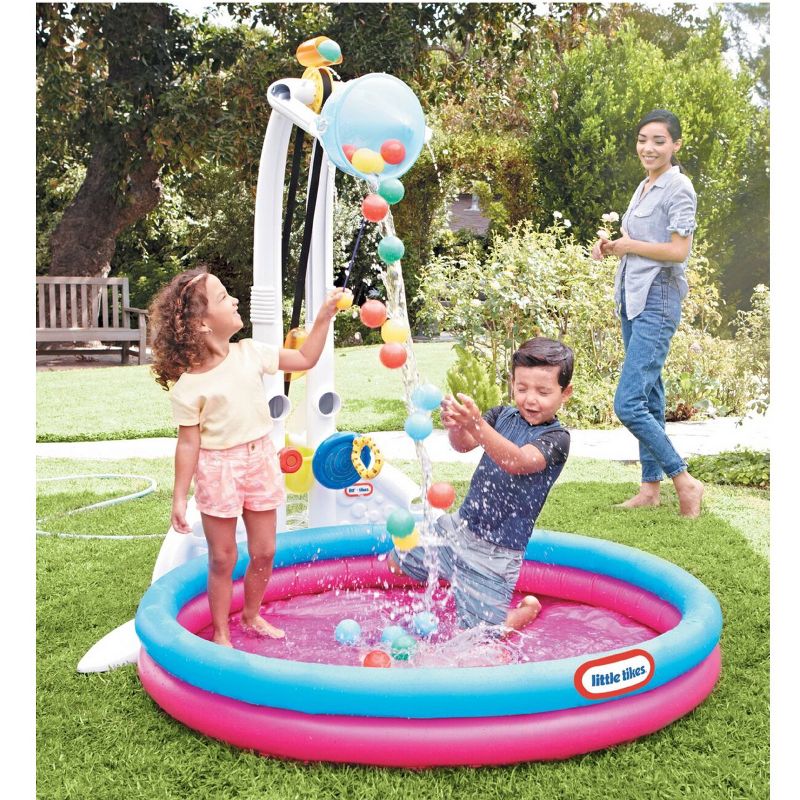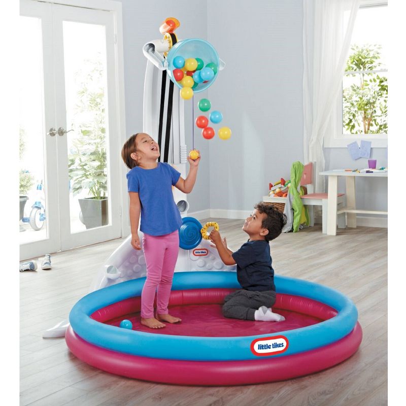 The versatile Little Tikes Indoor-Outdoor Amusement Park is a ball pit and wading pool that can be used indoors or outdoors. Kids can load up the conveyor belt with plastic balls and crank it themselves to fill the bucket overhead. Just one quick pull of the bucket cord sends a shower of water and/or plastic balls cascading down. The Indoor-Outdoor Amusement Park creates a double waterfall when attached to a standard garden hose for even more outdoor fun! Kids will love splashing in the pool and playing with the plastic balls and water-filled bucket.Get your kids up and active today with the Indoor-Outdoor Amusement Park from Little Tikes!