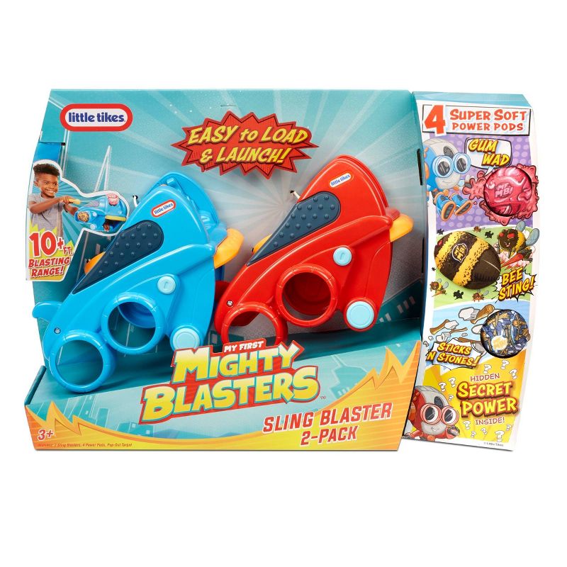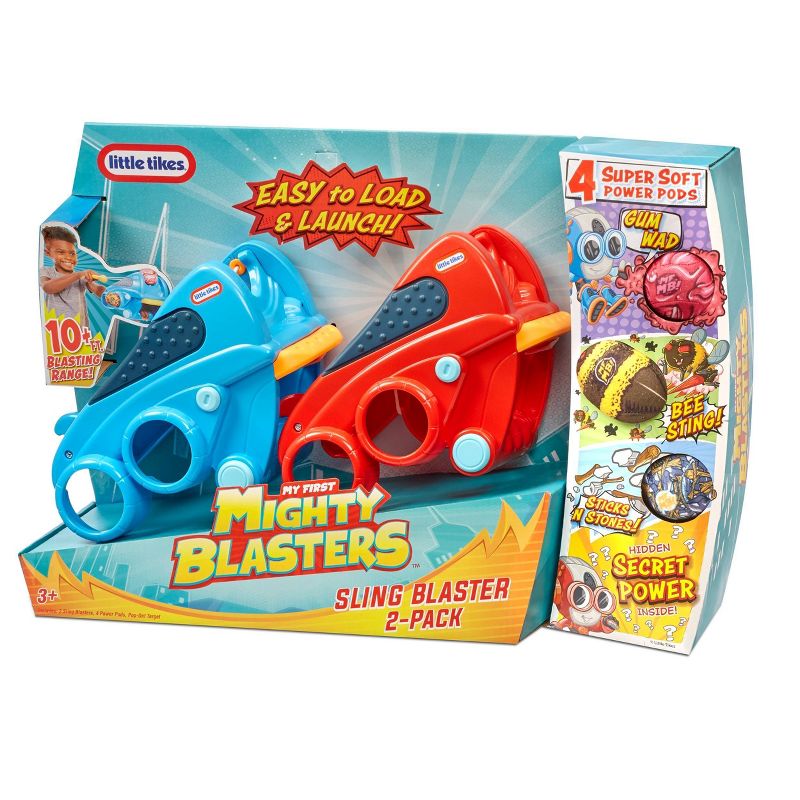 Little Tikes My First Mighty Blasters combine imaginative play with cool, safe blasters that are easy for preschoolers to use! Each blaster comes with colorful power pods that are soft, safe, and encourage kids to role play as heroes. Plus, all power pods work with every My First Mighty Blasters launcher. The more power pods kids collect, the more imaginative their role play becomes! With the Sling Blaster 2-Pack, kids can play together and launch Power Pods from their wrist! The Sling Blasters are perfect for on-the-go active play, easy to load and launch, and the 2-pack comes with four power pods including Bee Sting, Sticks N Stones, Gum Wad and one secret power.