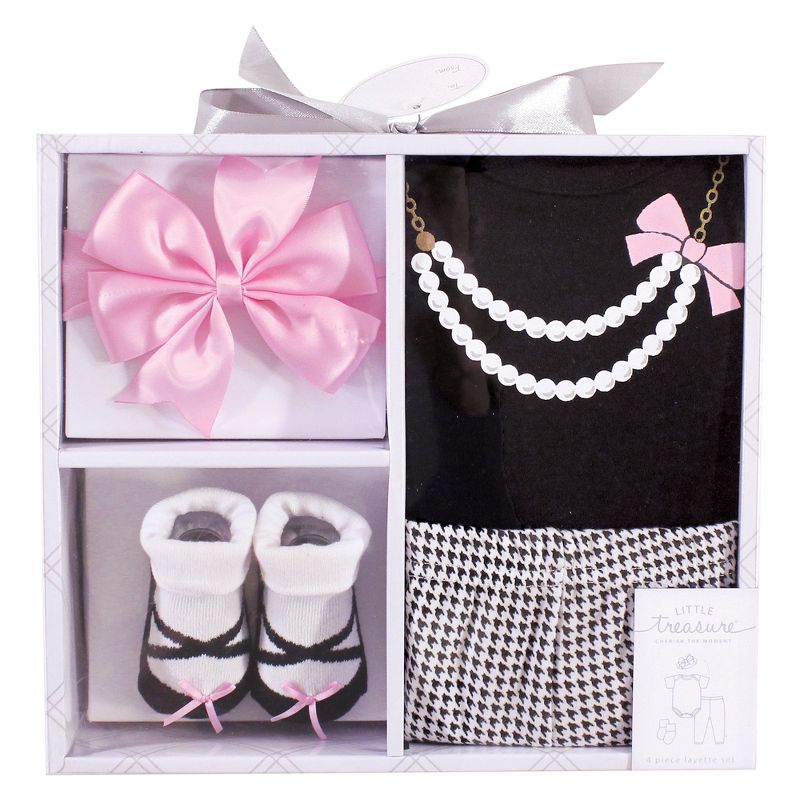 Little Treasure gift sets feature the cutest designs and patterns in one easy to gift box. Our starter set features a bodysuit, pant, cap or headband, and socks. Our fun and playful designs and high quality garments will make a terrific set for your little one. Little Treasure Baby Girl Boxed Gift Set, Black/Pink Pearls is a great baby essentials set for your little one.