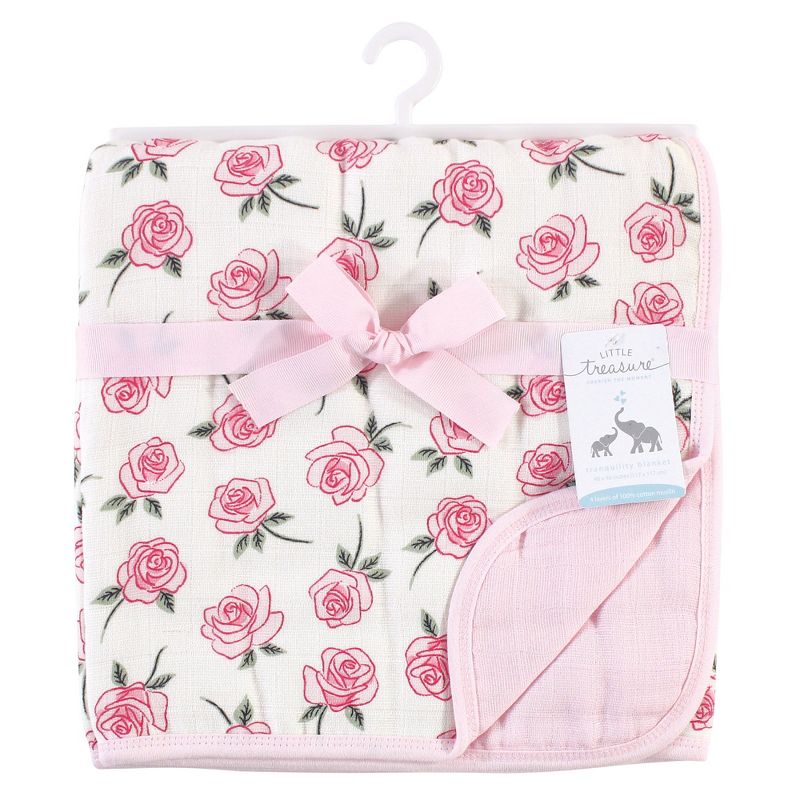 Little Treasure offers premium quality, stylish baby apparel and products at affordable prices. Our muslin tranquility blankets feature beautiful prints on four layers of lightweight, 100% quilted cotton muslin. Super soft and breathable, your little one will feel secure and safe without being too hot or uncomfortable while the extra weight soothes and comforts your baby. Our generously sized blankets make great stroller covers or nursing covers as well at 46x46 inches. Each arrives folded and tied with a ribbon, ready to wrap or drop into a gift bag. Little Treasure Baby Girl Cotton Muslin Tranquility Quilt Blanket, Rose is the perfect addition to your little one's nursery.