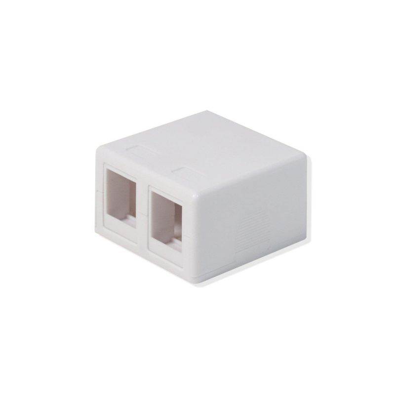 The 2 port surface mount box can be used with any connector. It is made of high impact ultra-durable plastics to ensure longevity. Two screws are provided to secure the surface mount to a baseboard, trim or elsewhere, as well as a double sided adhesive tape for mounting to a wall neatly and easily. Keystone jacks are not included.
