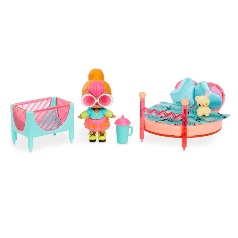 Unbox 10+ surprises with L.O.L. Surprise! Furniture with Neon Q.T. doll! The Bedroom pack includes a rereleased Series 2 character Neon Q.T., along with a heart-shaped bed, cute crib and accessories, so L.O.L. Surprise! dolls can get their nap time in. The box folds out to become a fabulous bedroom playset, where Neon Q.T. can host a sleepover will her BFFs. Collect all 4 styles to glam up the life of your L.O.L. Surprise! dolls with L.O.L. Surprise! Furniture.