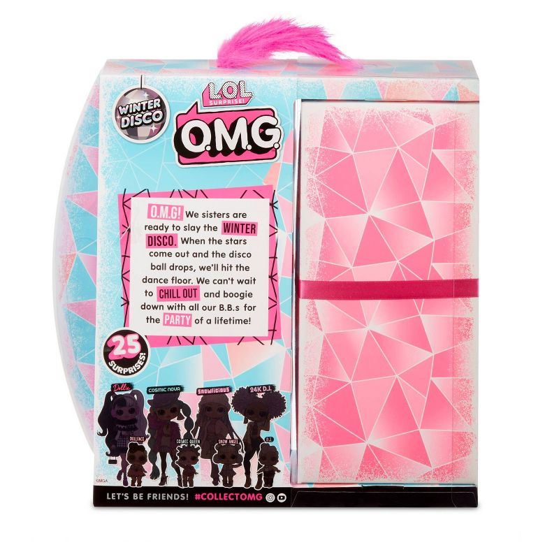 Unbox 25 surprises, including L.O.L. Surprise! O.M.G. Winter Disco fashion doll – Dollie – and her sister – Dollface. Dollie has highly detailed features, beautiful hair, and her own chic style. She's the big sister to fan favorite L.O.L. Surprise! character, Dollface, who is also included. The dolls come with a totally unique unboxing experience in a Winter Disco themed package with a fluffy handle and snow that disappears when the package is turned upside down. Open the side to unbox Dollface and reveal Dollie's surprises. Her fashions are ready to be unboxed from fabulous garment bags, her shoes have their own shoebox, and her hat box holds her accessories. Slide off the icy silhouette to reveal Dollie's picture. Find the ribbon and pull to spin Dollie around to find her bio and then reveal Dollie in her dressing room, where she's hanging out, ready to get dressed in her fierce fashions. Have her strike a pose to show her off on her included doll stand. The package becomes a reusable playset with a dressing room and chill out area. Each L.O.L. Surprise! O.M.G. Winter Disco includes a fashion doll, her sister, fierce fashions, shoes, a shoebox, accessories, a hat box, purse, a brush, garment bags, a doll stand and a package that becomes a reusable playset. Collect all 4 L.O.L. Surprise! O.M.G. Winter Disco fashion dolls.