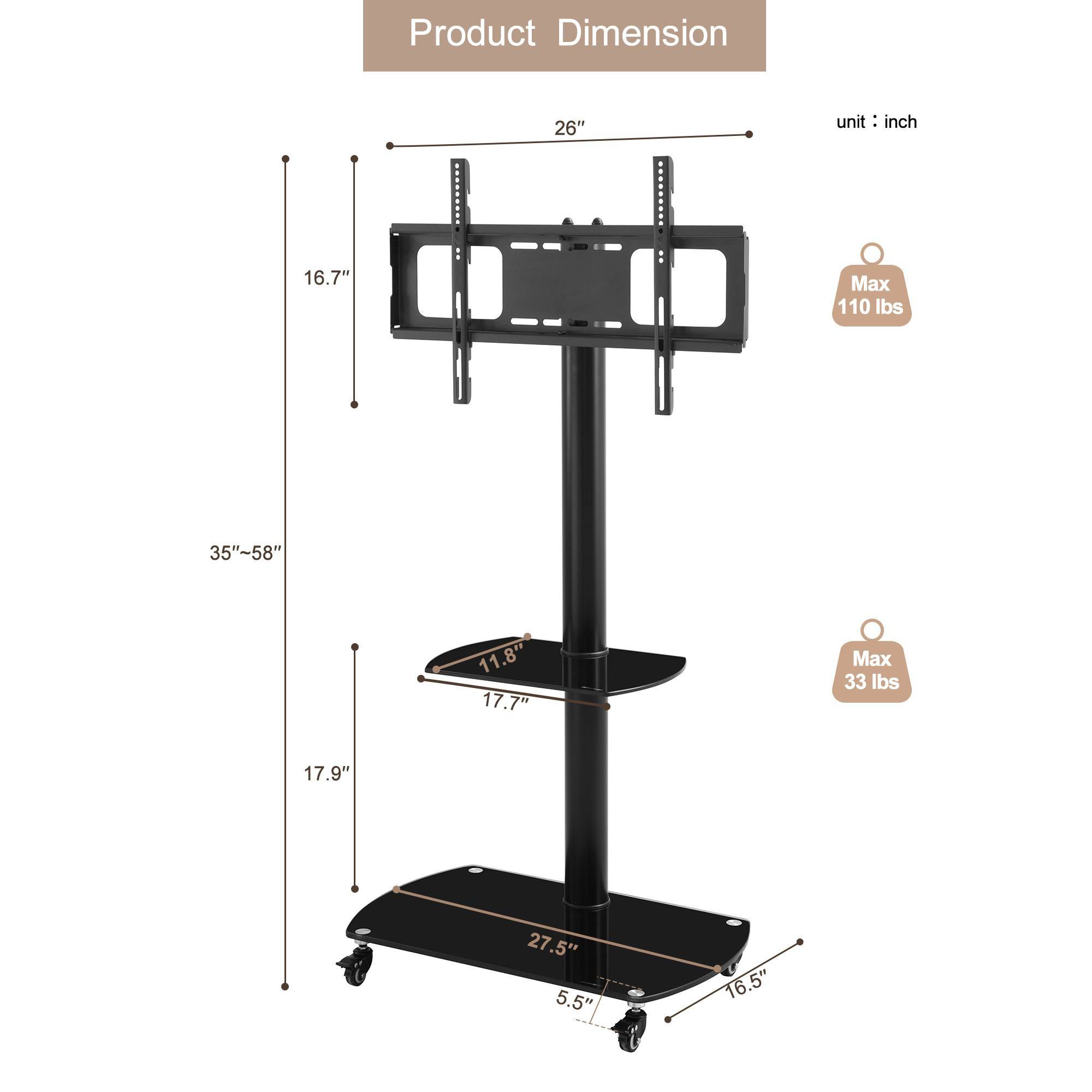Specifications: FITS 32-65 INCH TVS - This TV stand with mount will fit for most TVs from 32 to 65 inches. Also the VESA size can be divided into two ranges: 100 (h) mm x 100 (w) mm to 400 (h) mm x 600 (w) mm.