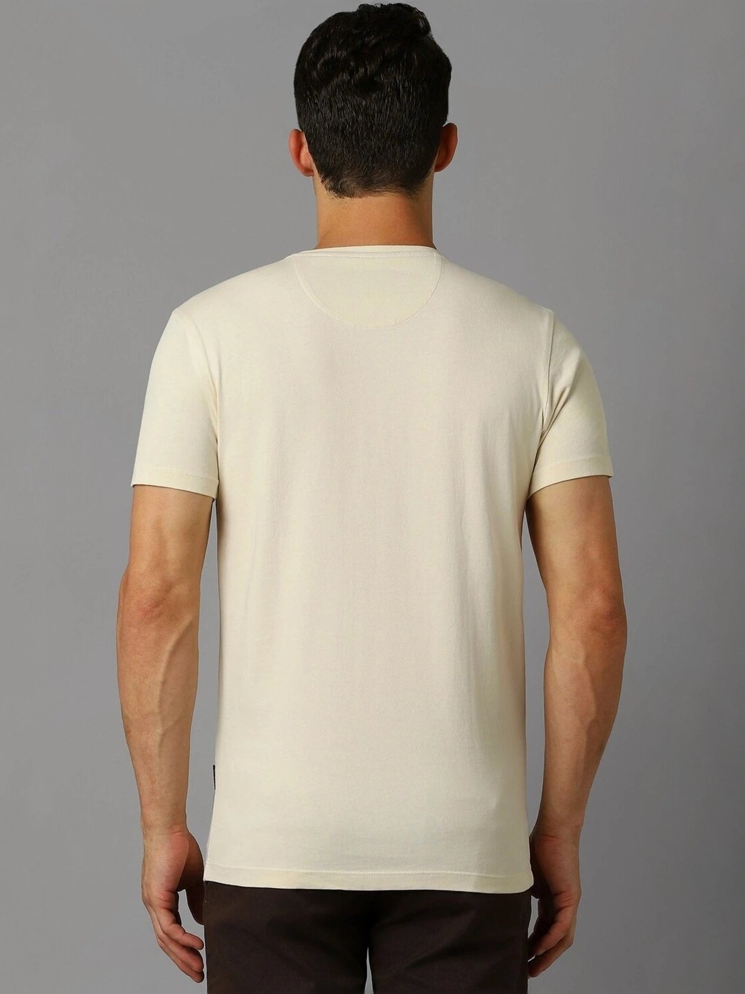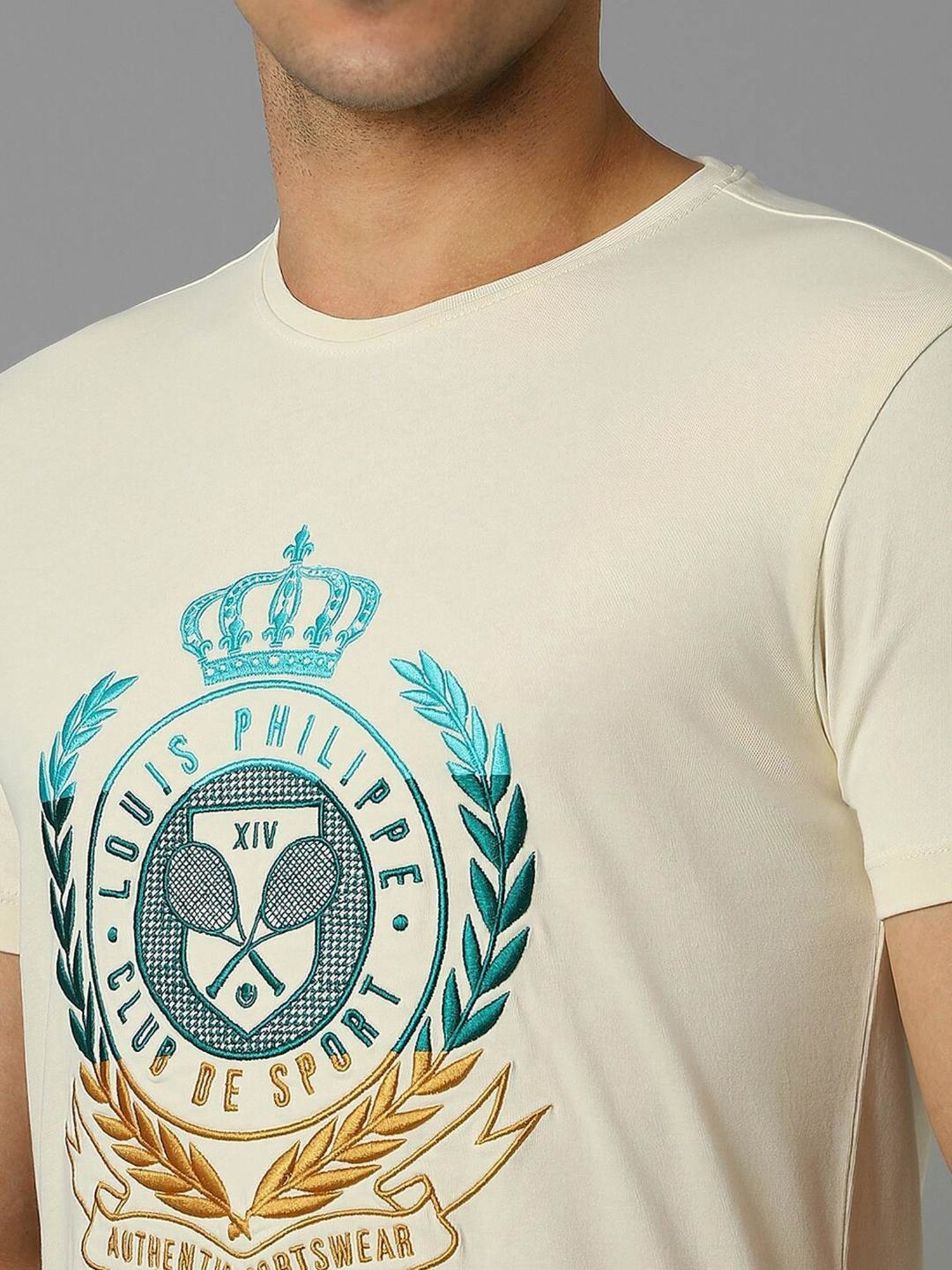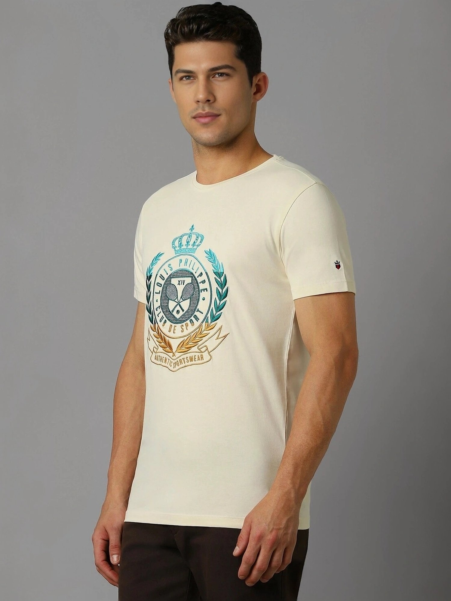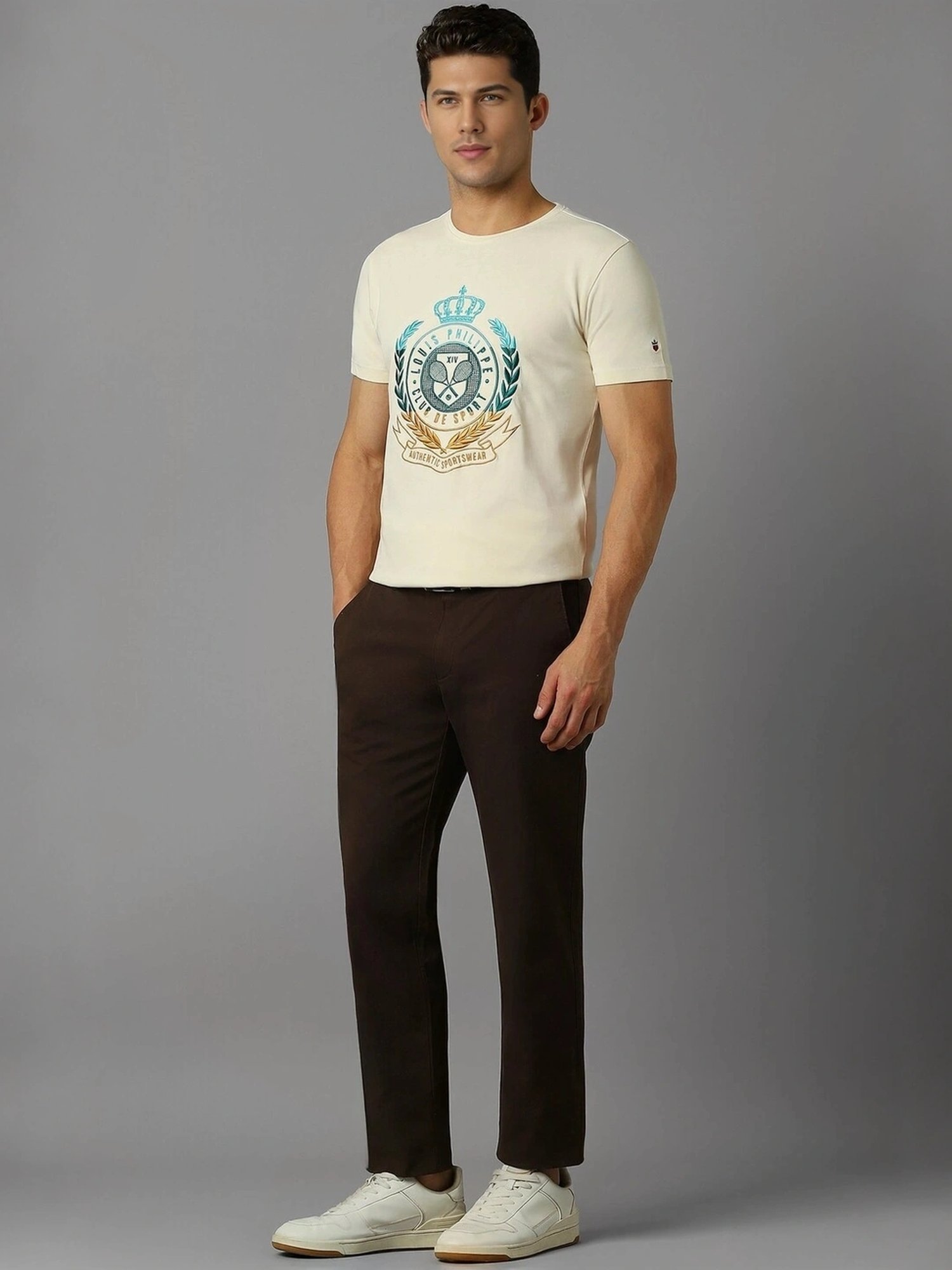 Amplify your wardrobe with this beige slim fit t-shirt from Louis Philippe. Tailored to sartorial perfection from premium quality fabric, it assures a soft and soothing touch against the skin. The round neck adds to its appeal. Exuding short sleeves, it is sure to fetch you compliments from all. The printed pattern makes it a captivating choice.