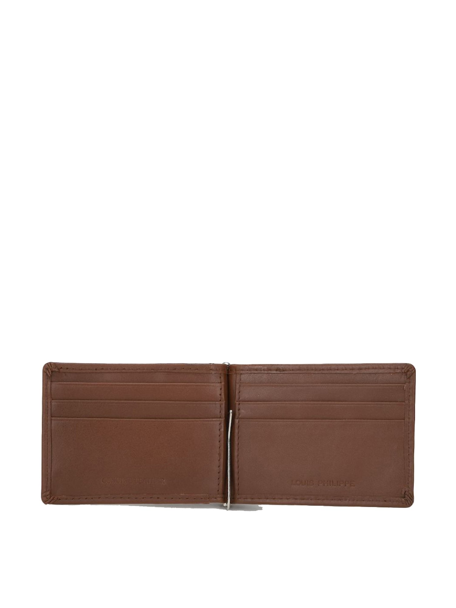 Pocket this money clip wallet from Louis Philippe and get appreciated for your classy choice. Exuding a solid pattern and a brown hue, this money clip wallet will be a perfect pick for you. Manufactured using high-quality leather, it is long lasting. With spacious compartments, it will allow you to accommodate credit cards, currency notes and identity cards in a safe manner.