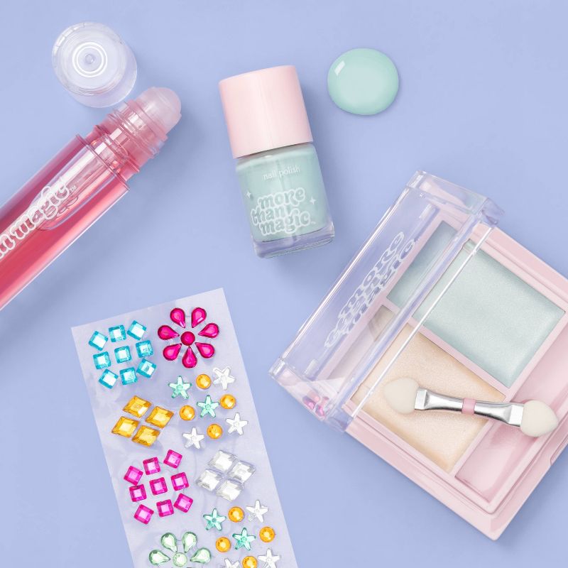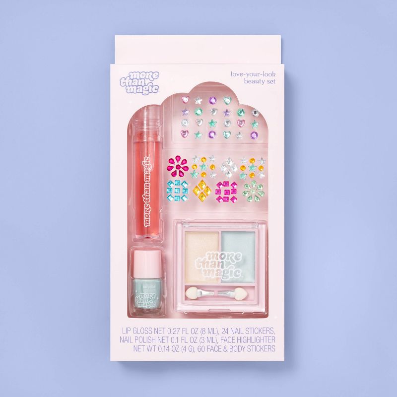 The Look in a Box Set from More Than Magicâ„¢ makes it easy for your girl to create her own magically glam looks. With a roll-on lip gloss, shimmery nail polish, two colors of facial highlighter and tons of stick-on gems for her nails and skin, this set has everything she needs to shimmer and shine with her own style. From jeweled manicures to bold highlighting and facial gems, she'll love creating an array of standout beauty looks that are sure to dazzle.