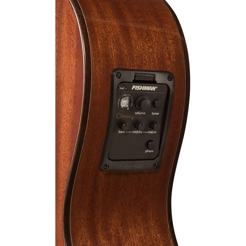 The LC150SCE adds a cutaway and premium Fishman Clasica III preamp to the striped sapele and solid spruce combination of the LC150S model. The cutaway provides unfettered access to the higher frets, and the Fishman Clasica III preamp boasts 3 bands of EQ and a built-in tuner, combined with their renowned Sonocore under saddle pickup, so true nylon-string tone can be amplified. Lucero Classical and Flamenco Guitars - Best-in-class value and built to last, Lucero instruments are carefully crafted to provide years of rich, toneful sound and at an attractive price. Lucero creates beautiful classical guitars for every type of player, from beginners embarking on their musical journey to steel-string players looking to expand their skills (and their tool box) with the authentic sounds of a nylon-string guitar. Using superior tonewoods (like spruce, cedar and mahogany) as well as manufacturing techniques seen in instruments costing much more, Lucero is priced for budget-conscious players who still demand a great-looking, highly playable classical guitar. Students especially will appreciate the low action that makes for better overall playability. Acoustic-electric models include Fishman pickups with EQ control that is perfect for performance environments. Acoustic-electric models also have built-in chromatic tuners to keep sounding best. Lucero makes beautiful classical guitars amazingly affordable.