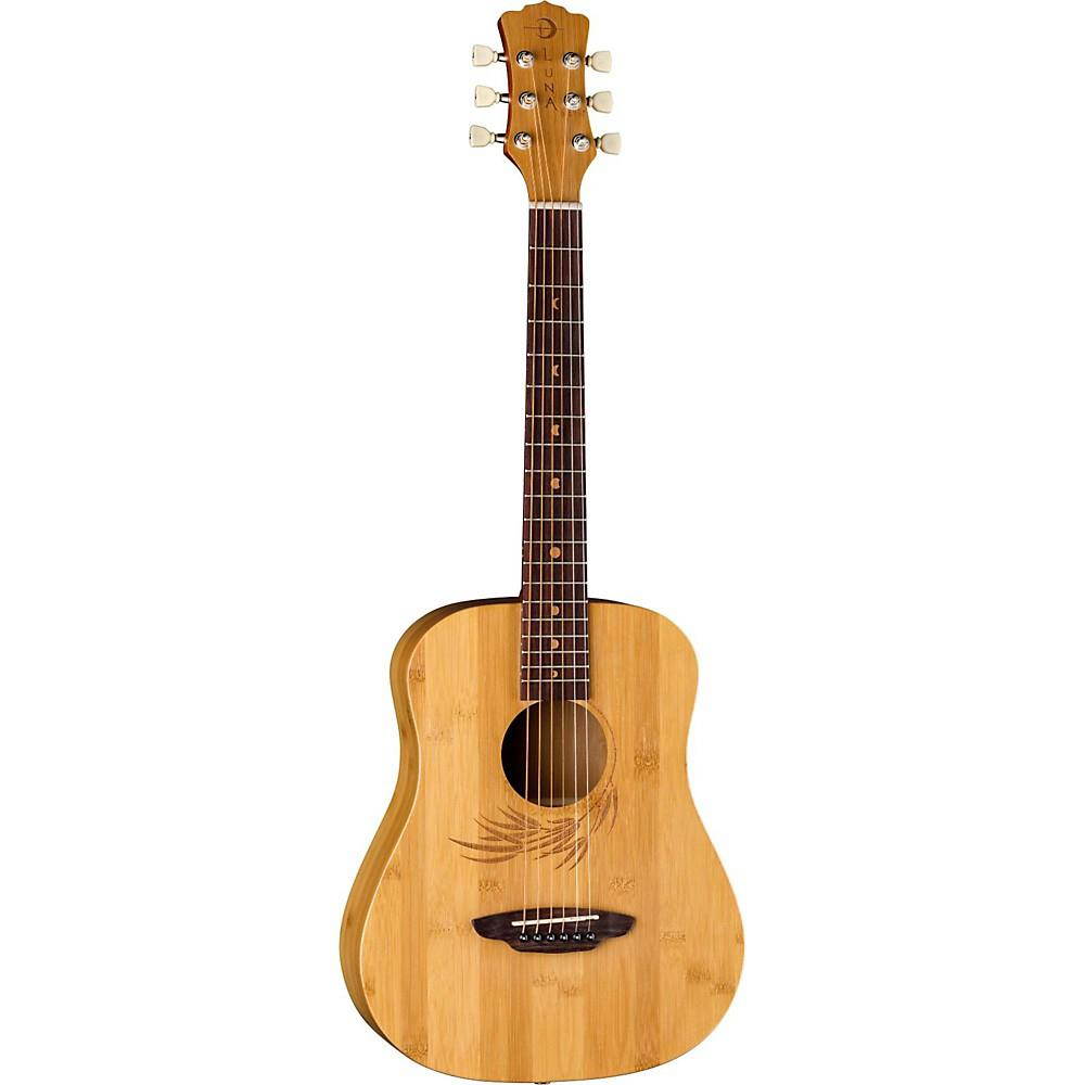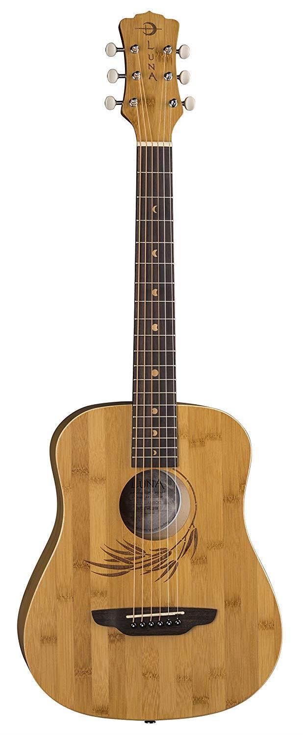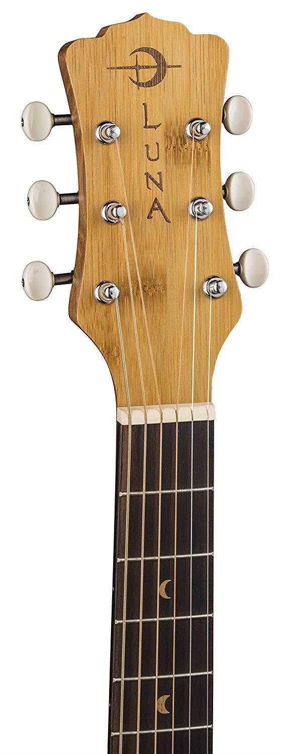 The Luna Safari Bamboo guitar is a 3/4 dreadnought travel acoustic that has a bamboo top, back, and sides, as well as a bamboo leaf laser etching around the soundhole. Luna Safari Guitars deliver full size tone and tonal voice that belie their small size. Beautifully handcrafted from bamboo and rosewood, the Safari boasts quality construction to match its sound and stunning design. Whether you are looking for a guitar for impromptu gigs, younger players as a student guitar or songwriting on the go, this Luna Safari Bamboo guitar is perfect for a variety of players and needs.