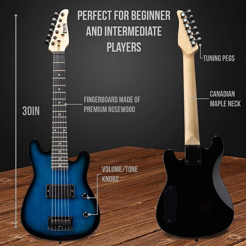 • Perfect for beginner and intermediate players; the guitar is 30” and features tuning pegs, fingerboard made of premium rosewood, Canadian maple neck, & volume/tone knobs