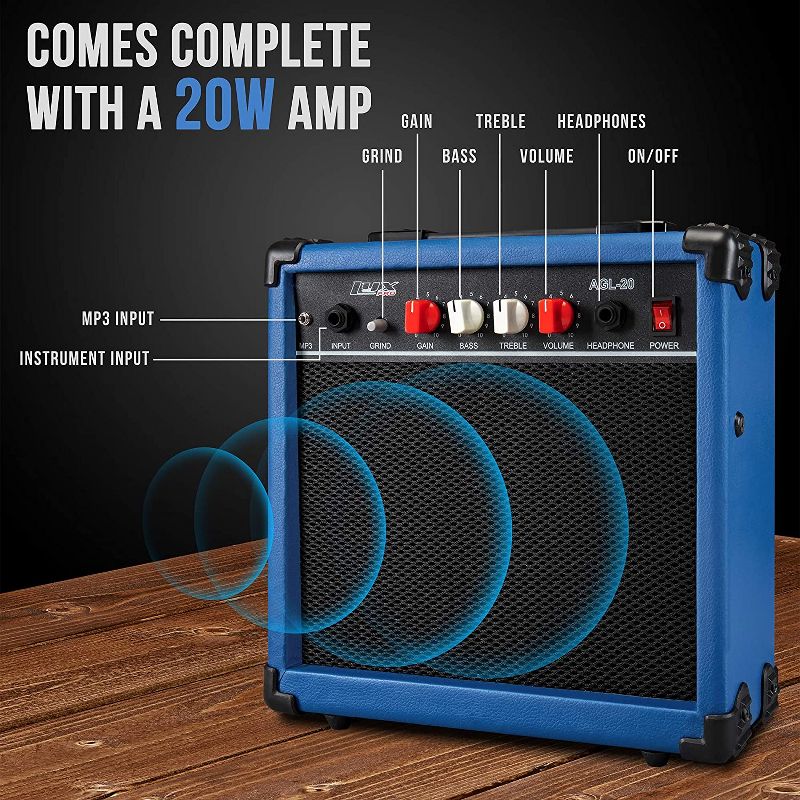 • Comes complete with a 20W AMP, instrument input, MP3 input, grind, gain, bass, treble, volume, headphones, & on/off switch