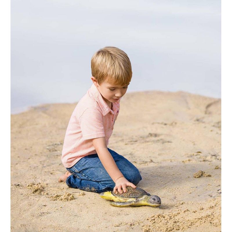 Realistic in markings, coloration, and scale, our Sea Turtle measures 12"L x 7½"W x 4½"H. The high-quality natural latex rubber construction holds up for indoor, outdoor, and classroom play (do not submerge in water). Children will love the realistic feel of the plated shell! Especially for children interested in reptiles, this turtle is a wonderful addition for any study of sea life. Made in Sri Lanka.