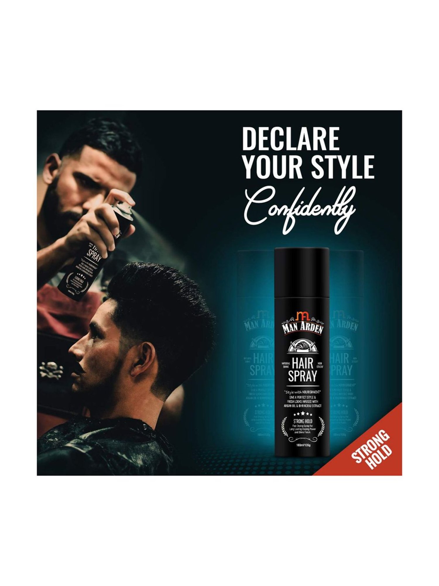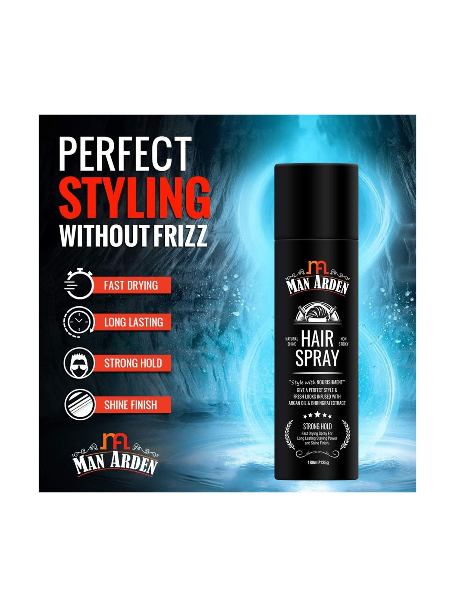 Manage your desired hairstyle throughout the day with Man Arden hair spray. Enriched with natural moisturizing and nourishing ingredients, it has a unique formulation that supports style with nourishment. It gives an extra-strong hold without any stickiness. Argan oil keeps hair hydrated and healthy and adds a natural sheen to the locks. It protects the hair from the harmful effect of exposure to UV rays and pollution. Bhringraj oil helps to control hair fall. Vitamin E helps to keep the scalp and hair healthy as it has natural antioxidant effects. It is also mineral oil-free.